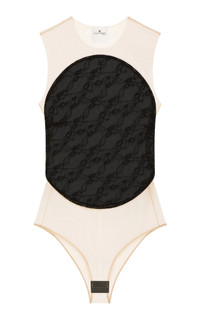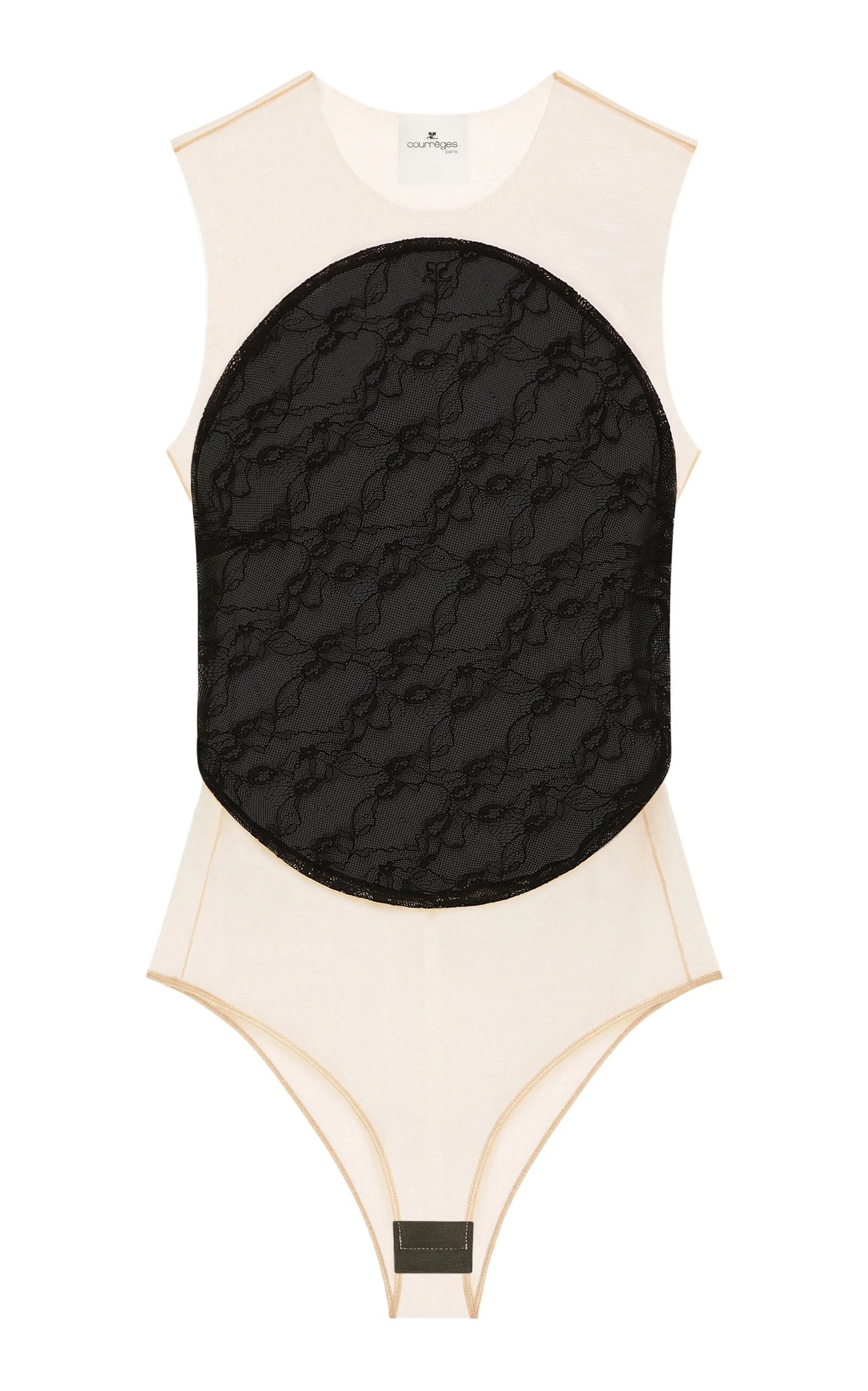After 12 years alongside Nicolas Ghesquiere and a brief stint at Dior with Raf Simons, Courreges artistic director Nicolas Di Felice has brought the renowned French fashion house back to life. This sleeveless bodysuit is cut from sheer stretch mesh with a contrasting circular lace panel. It fits close to the body and fastens with snaps at the base. Wear it with low-rise trousers or layered underneath a jacket. PRODUCT DETAILS - Pre-Fall '25 - Snap fastening at base - Composition: 90% polyamide/nylon 10% elastane - Dry clean - Made in France