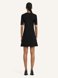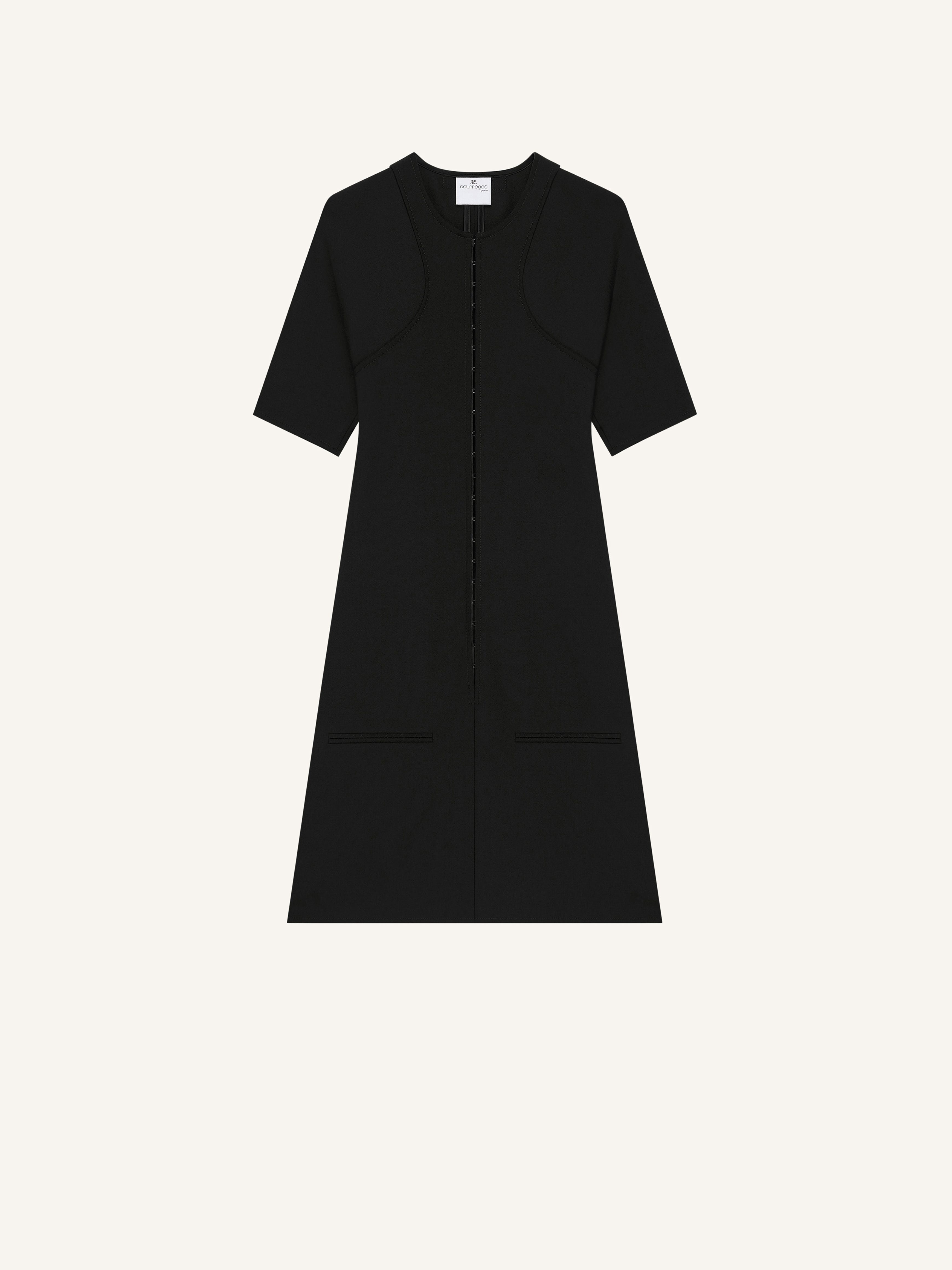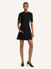 Short A-line dress with mid-length sleeves and couture hooks fastening. Two front welt-pockets. The model is 1.75m tall and wears a size 36. DETAILS Composition: 51% polyester, 41% wool, 4% elastane, 4% polyamide Country of Manufacture: SK SKU: 125CRO549PL01709999 Color: Black