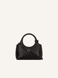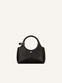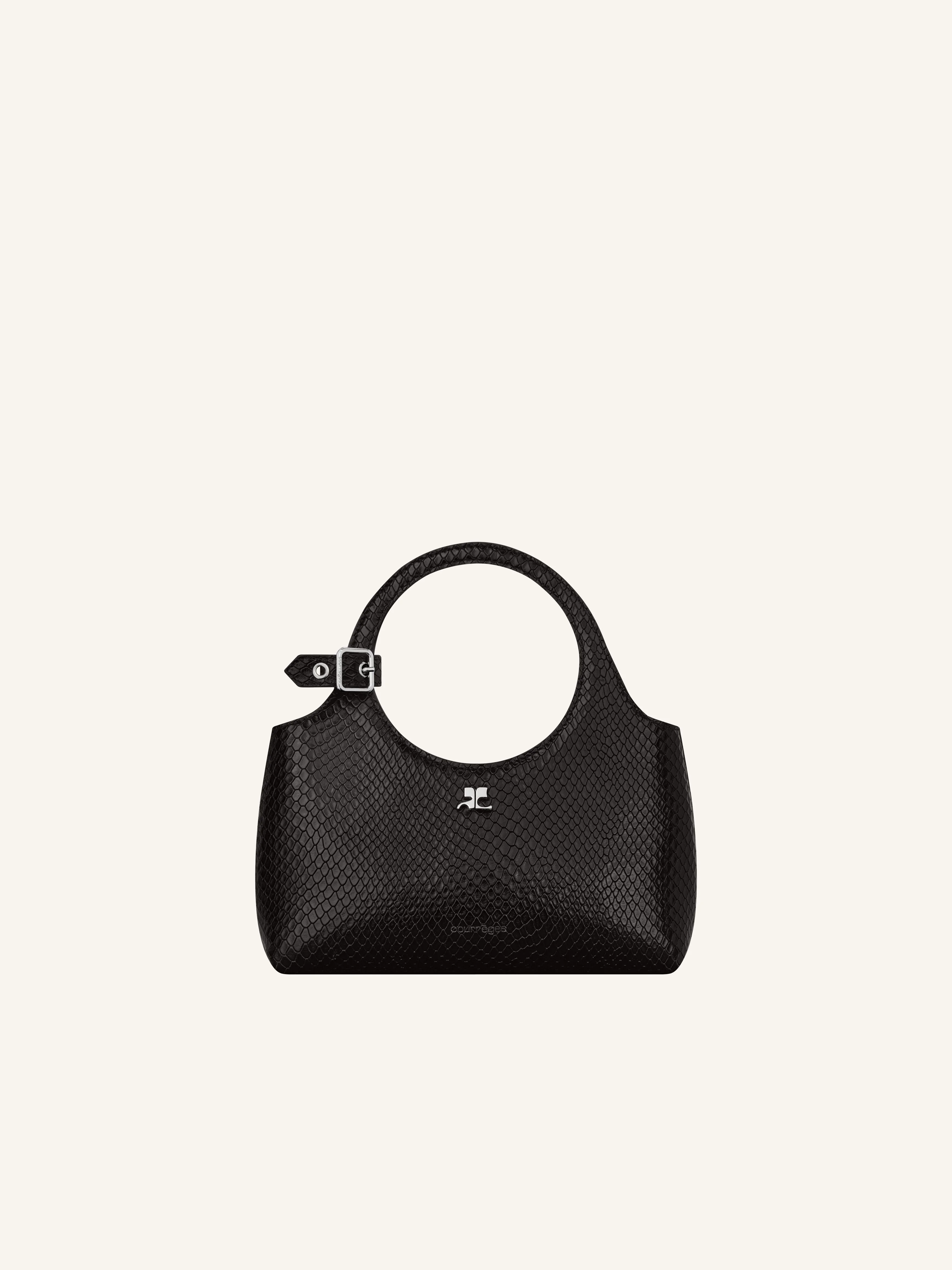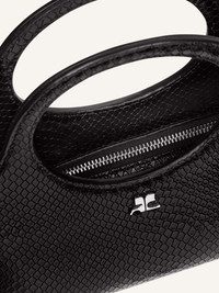 Viper effect calf leather Mini Holy Day bag. Zipped closure and metallic AC logo. Embossed "Courreges" logo on front. Buckle detail on handles and interior pocket. Adjustable and removable shoulder strap. Length: 18,5 cm Height: 20,5 cm Opening width: 17 cm Strap length: 107 cm DETAILS Composition: 100% calf leather Country of Manufacture: IT SKU: 325GSA163CV00459999 Color: Black