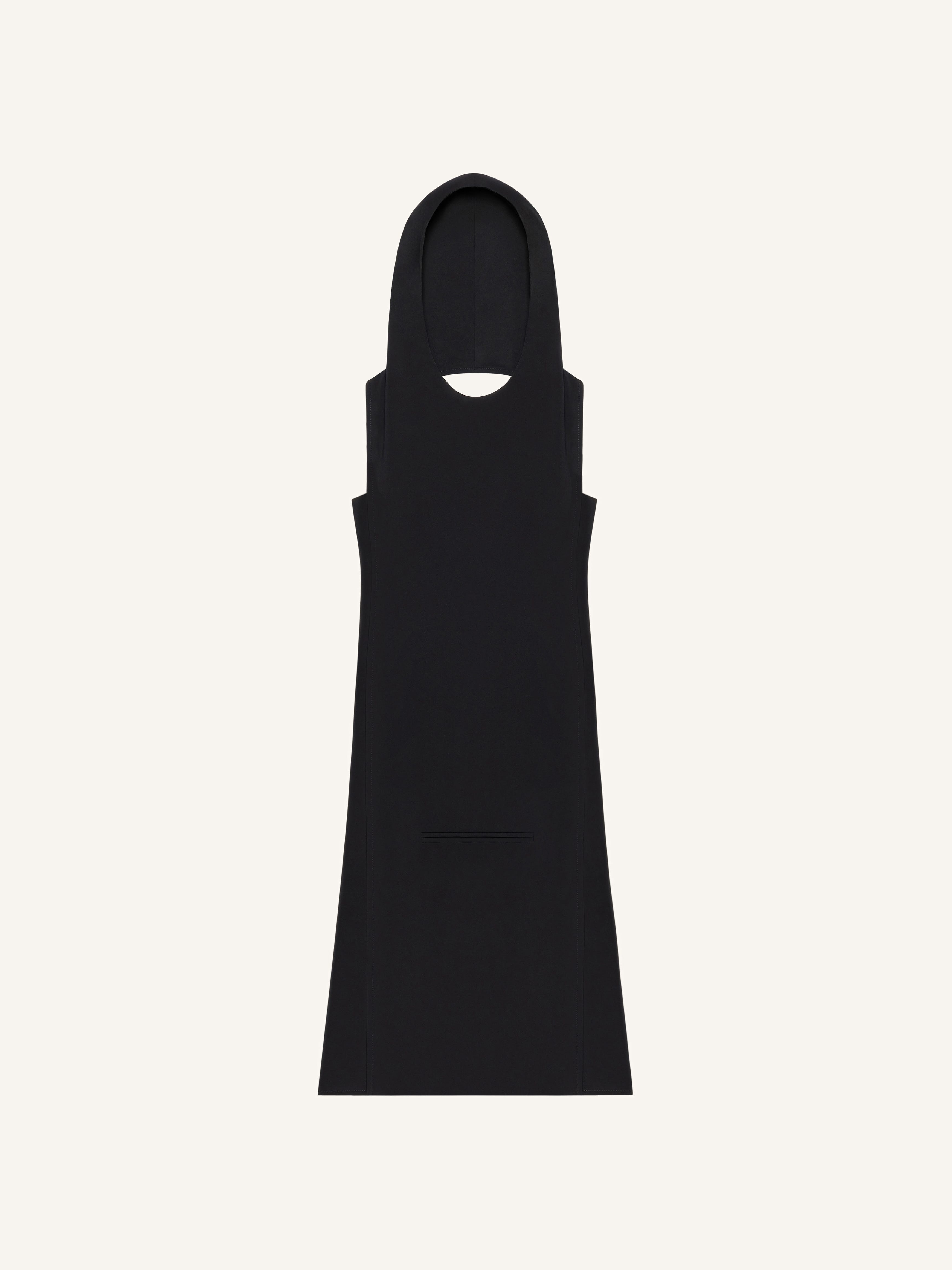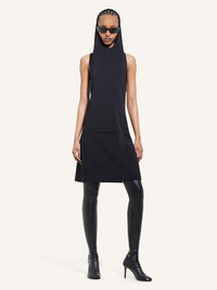 Hooded trapeze mini dress with center front welt pocket. Sleeveless. Bare upper back. The model is 1.76m tall and wears a size 36. DETAILS Composition: 89% polyester, 11% polyurethane Country of Manufacture: FR SKU: 424CRO526PL01599999 Color: Black