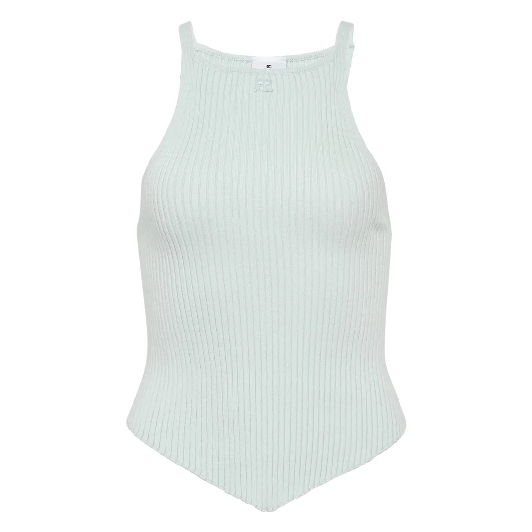 600079347LBL00L / 125MTO042FI0001/00/7038 - Premium ribbed knit construction - Signature pointy hemline - Sleeveless tank design - High neckline - Slim fitted silhouette - Stretch fabric for comfort Courreges Signature Pointy Rib Knit Top delivers modern French sophistication with architectural design details. Crafted from premium ribbed knit fabric in soft mint green, featuring the brand's signature pointy hem construction and slim tank silhouette. The structured ribbing and contemporary cut create a refined statement piece that embodies Courreges' futuristic aesthetic.