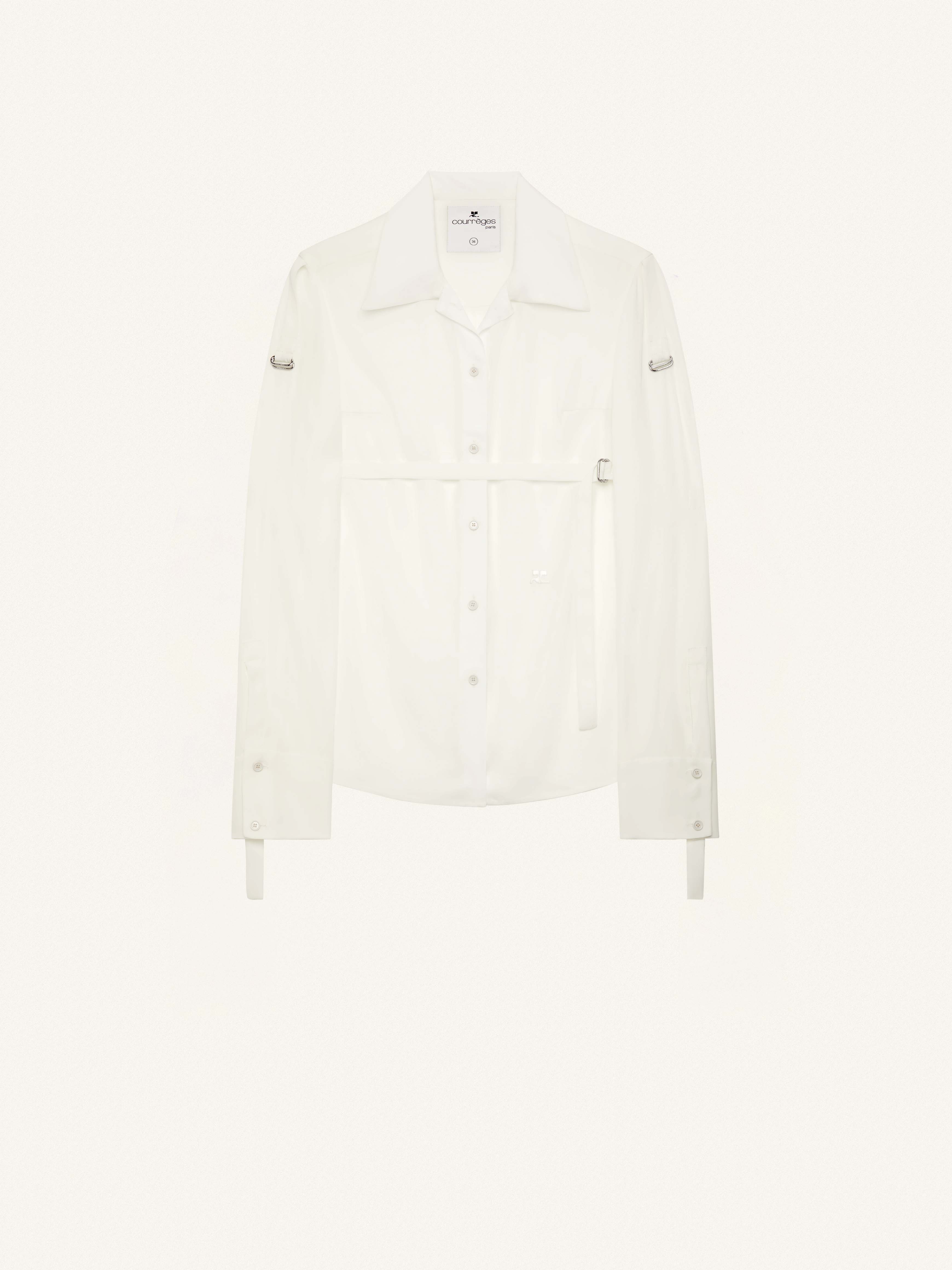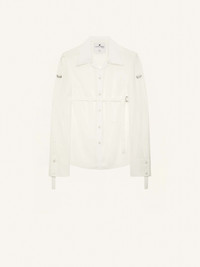 Mixed silk fluid fitted shirt with shoulder and bust buckle straps, cuff straps , AC logo and buttonned slit in the back. DETAILS Composition: 82% Viscose 18% Silk Country of manufacture: Italy Color: Heritage White Item code: 323CCH033VI0042