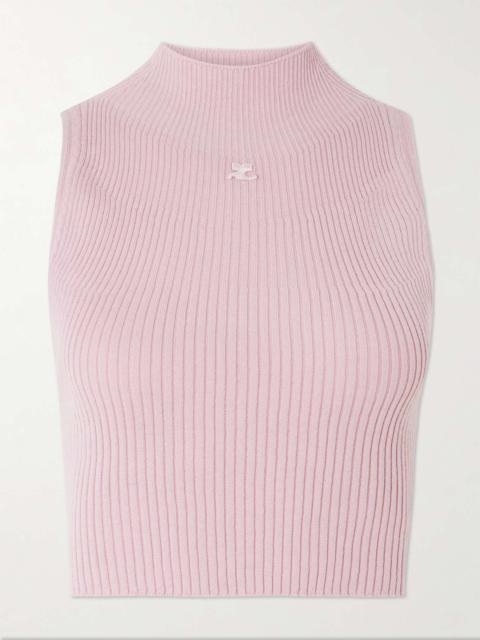 Cropped appliquéd ribbed cotton and merino wool-blend tank Blue