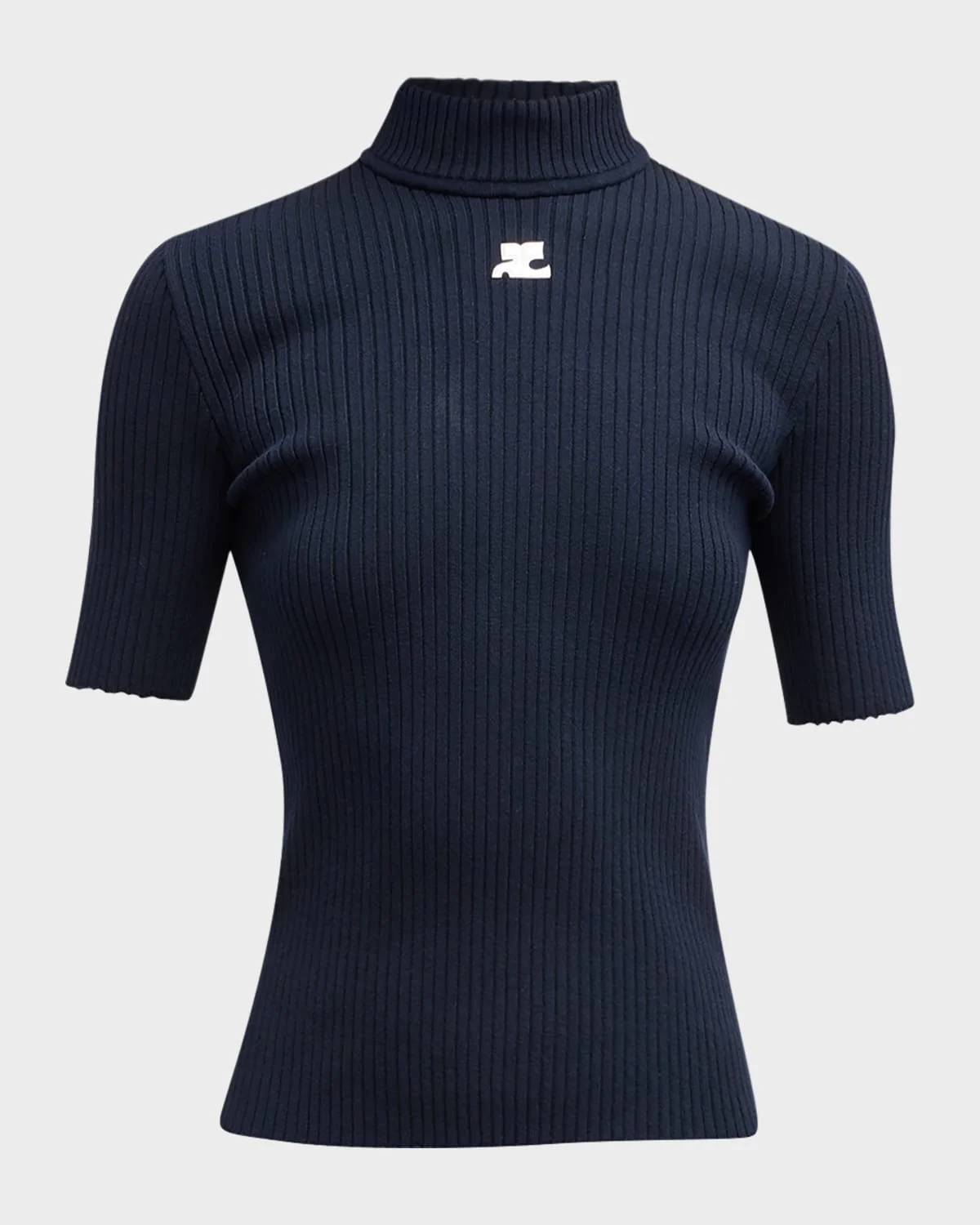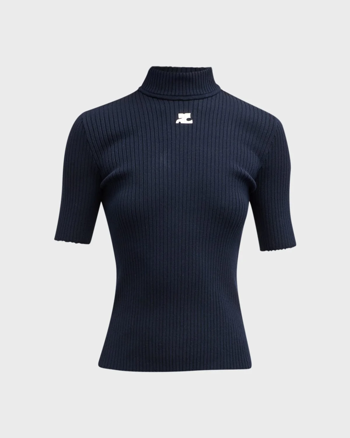 - Courreges ribbed knit sweater features logo embroidered front - Mock neckline - Short sleeves - Fitted - Pullover style - Viscose - Imported - Model is 5'10"/177cm.