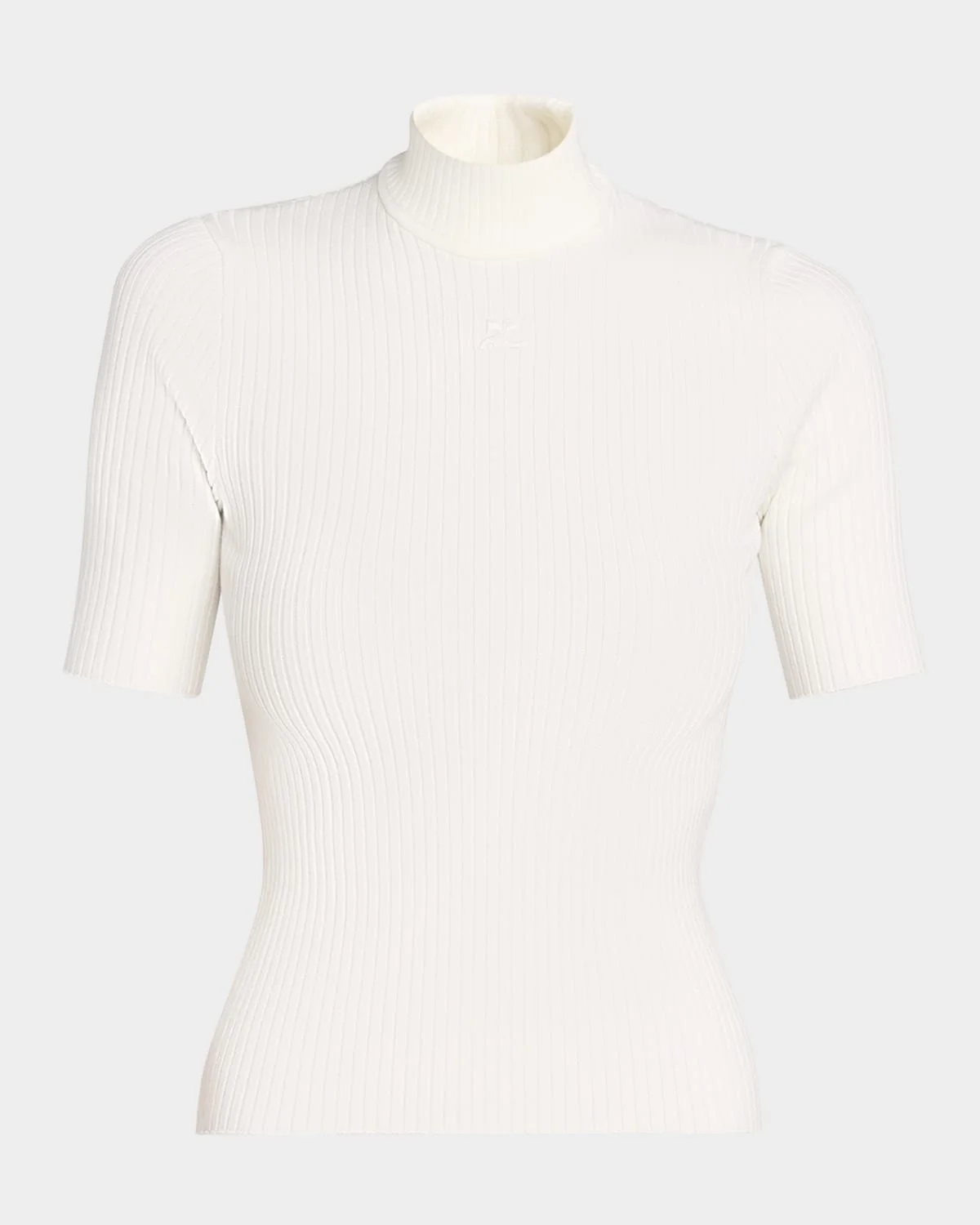 Courreges ribbed knit sweater features logo embroidered front Mock neckline Short sleeves Fitted Pullover style Viscose Imported