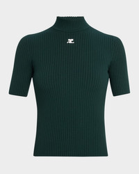 Courreges ribbed knit sweater features logo embroidered front Mock neckline Short sleeves Fitted Pullover style Viscose Imported