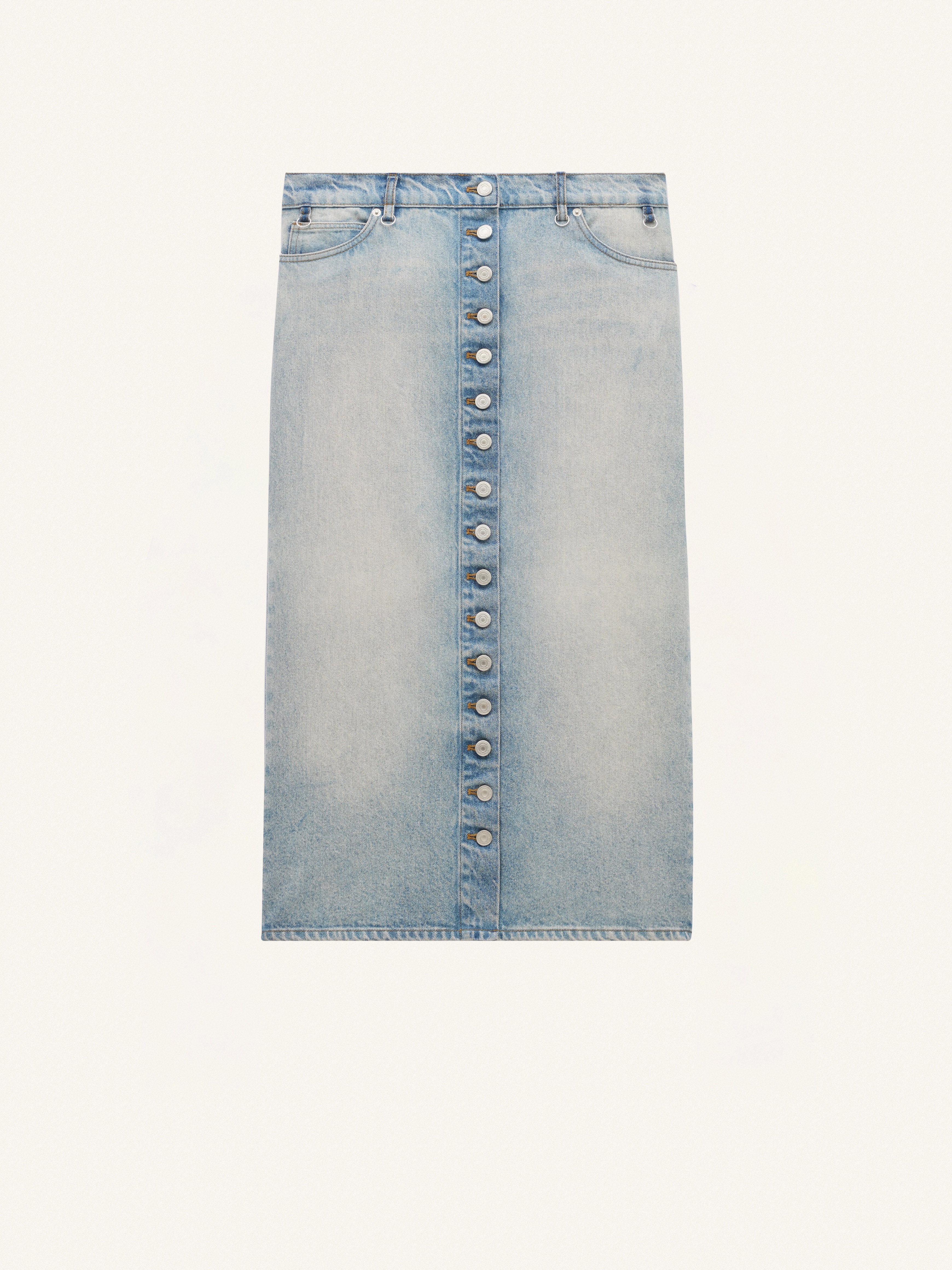 This denim long skirt has patch pockets and multiple flex buttons. DETAILS Composition : 100% Coton Pays de fabrication : Tunisie Couleur : Bleu Clair Code Article : 124DJU155DE0016