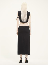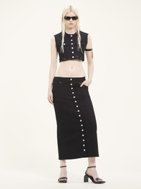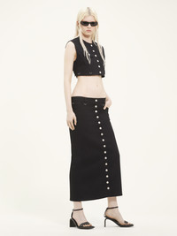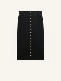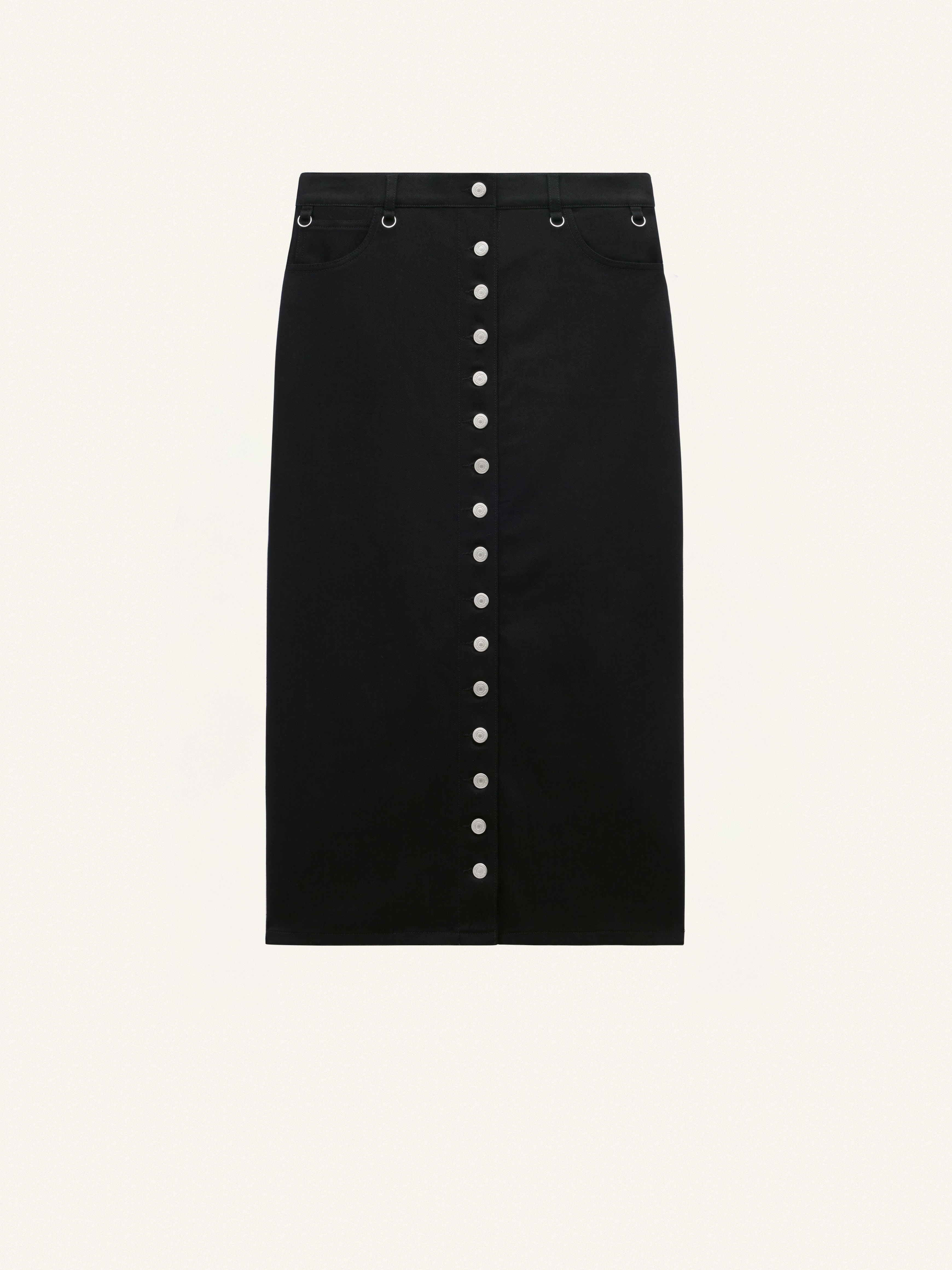 This denim long skirt has patch pockets and multiple flex buttons. DETAILS Composition : 98% Cotton, 2% Elasthanne Pays de fabrication : Italie Couleur : Noir Code Article : 124DJU155DE0020