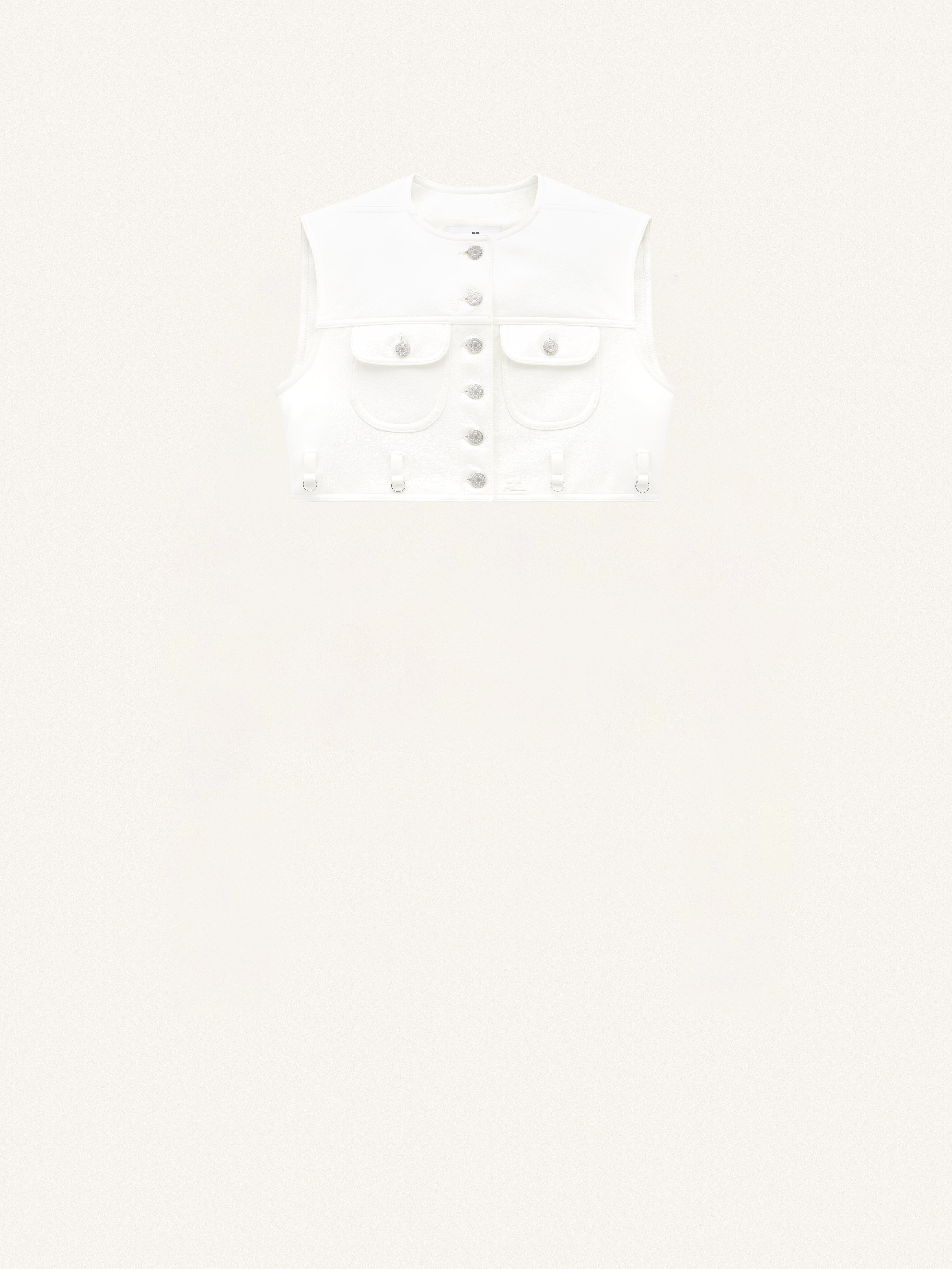 This cropped sleeveless vinyl vest has two front round pockets and flex buttons. DETAILS Composition : 88% Coton, 10% Polyuréthane, 2% Elasthanne Pays de fabrication : Serbie Couleur : Blanc Heritage Code Article : 124CBL153VY0014