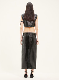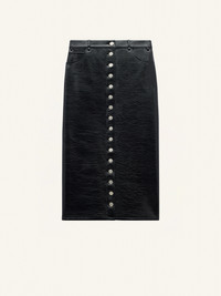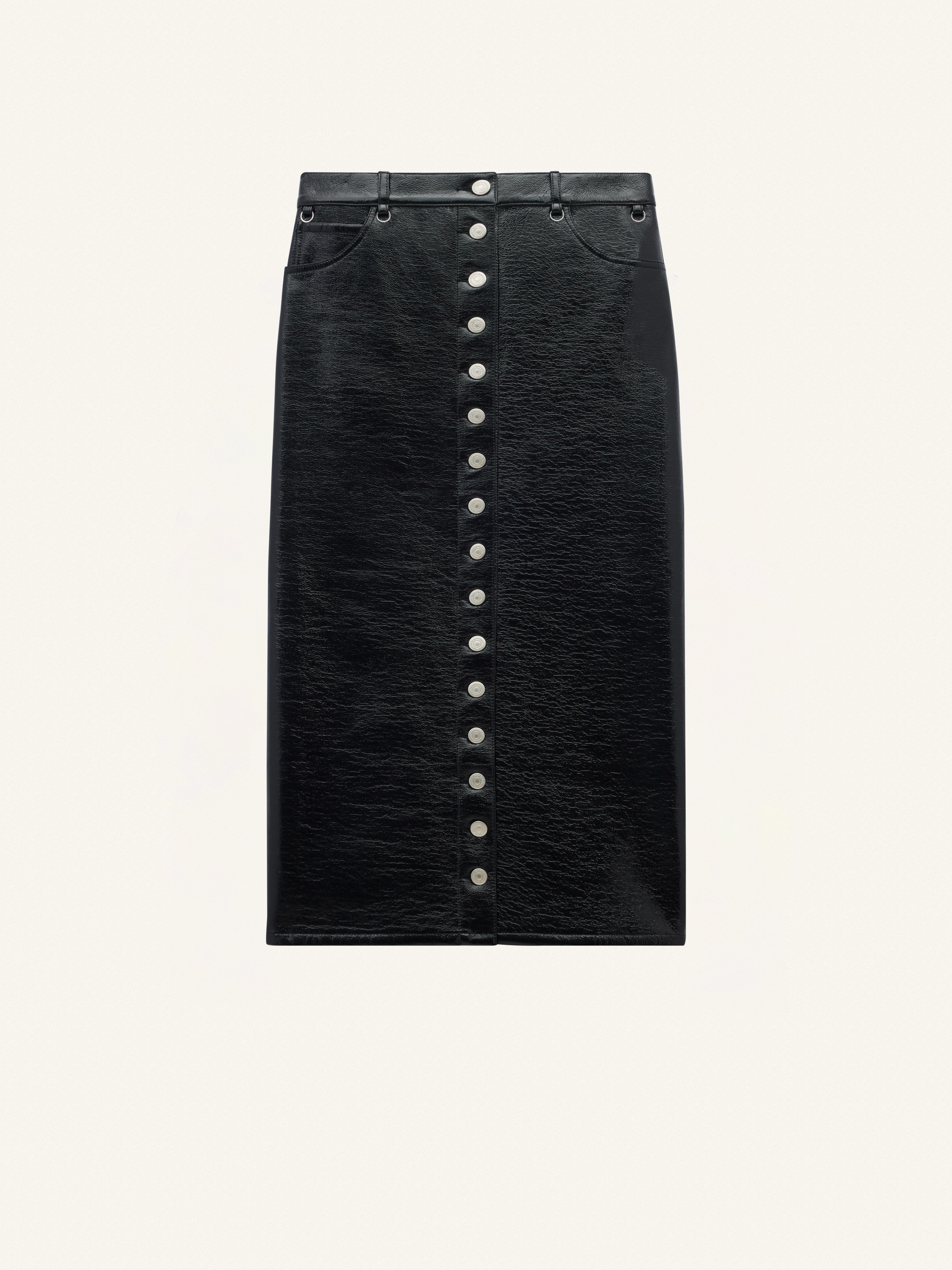This vinyl long skirt has patch pockets and multiple flex buttons. DETAILS Composition : 88% Coton, 10% Polyuréthane, 2% Elasthanne Pays de fabrication : Portugal Couleur : Noir Code Article : 124CJU155VY0014