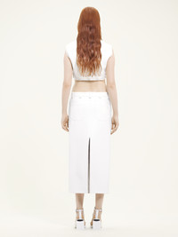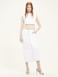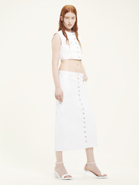 This vinyl long skirt has patch pockets and multiple flex buttons. DETAILS Composition : 88% Coton, 10% Polyuréthane, 2% Elasthanne Pays de fabrication : Portugal Couleur : Blanc Heritage Code Article : 124CJU155VY0014