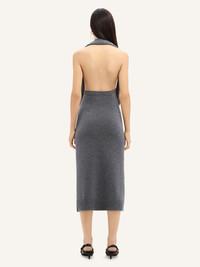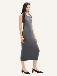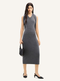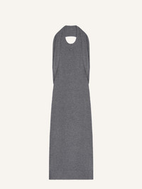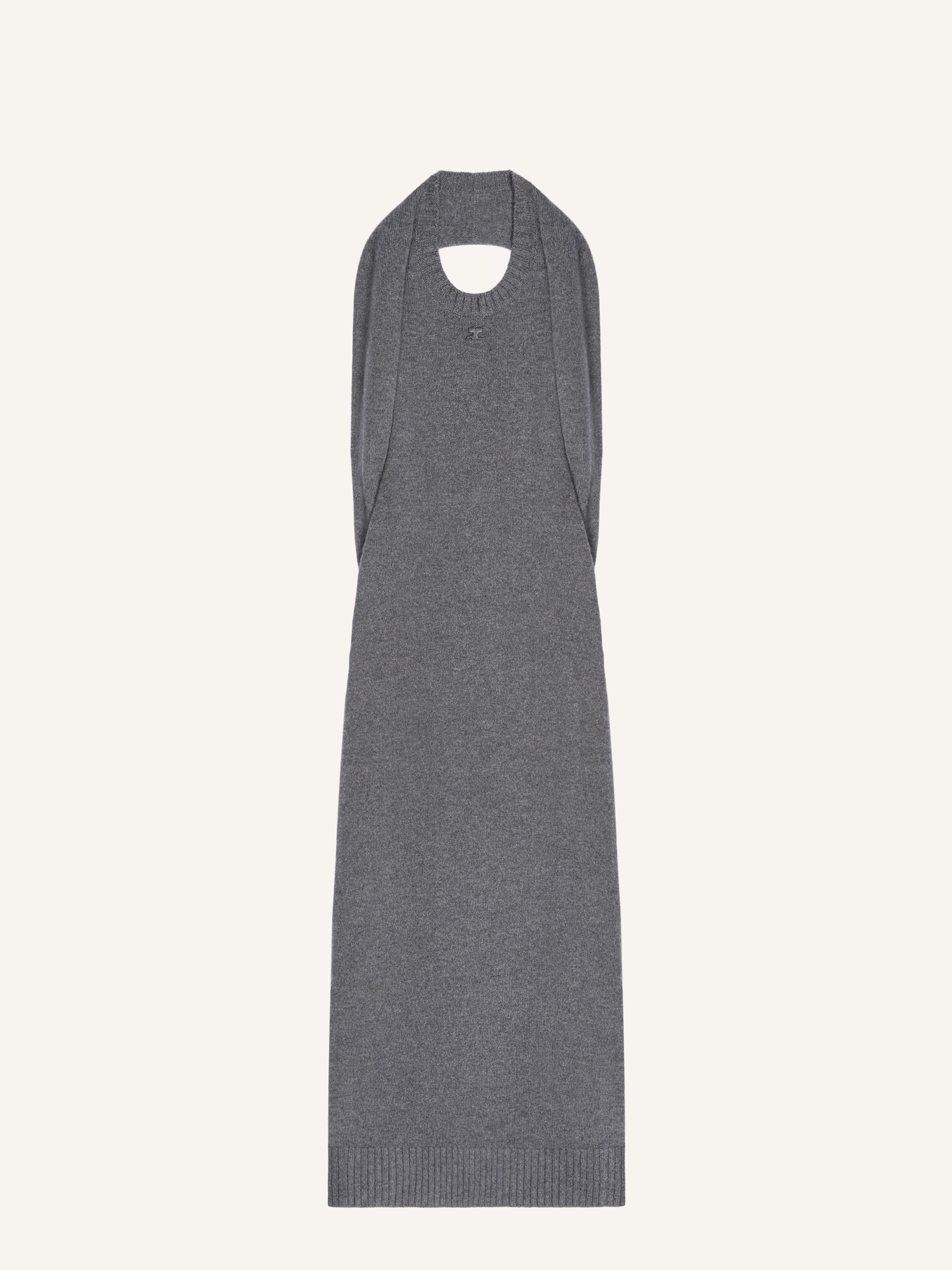 Sleeveless open-back long lambswool dress, draped over the shoulders. Round collar with AC logo underneath. The model is 1.78m tall and wears a size S. DETAILS Composition: 100% wool Country of Manufacture: IT SKU: 324MRO467FI00629001 Color: Heather Grey