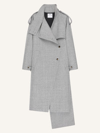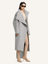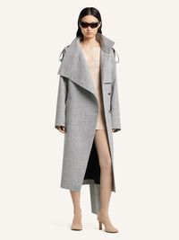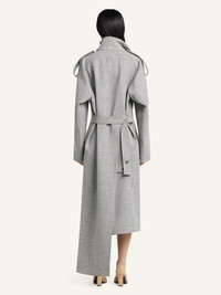 Long double breasted caviar wool trench coat with two side pockets and asymmetrical back panel. Zipped sleeves and adjustable belt. The model is 1.77m tall and wears a size S. DETAILS Composition: 100% wool Country of Manufacture: SK SKU: 425CMA258WO01500098 Color: Heritage White/Black