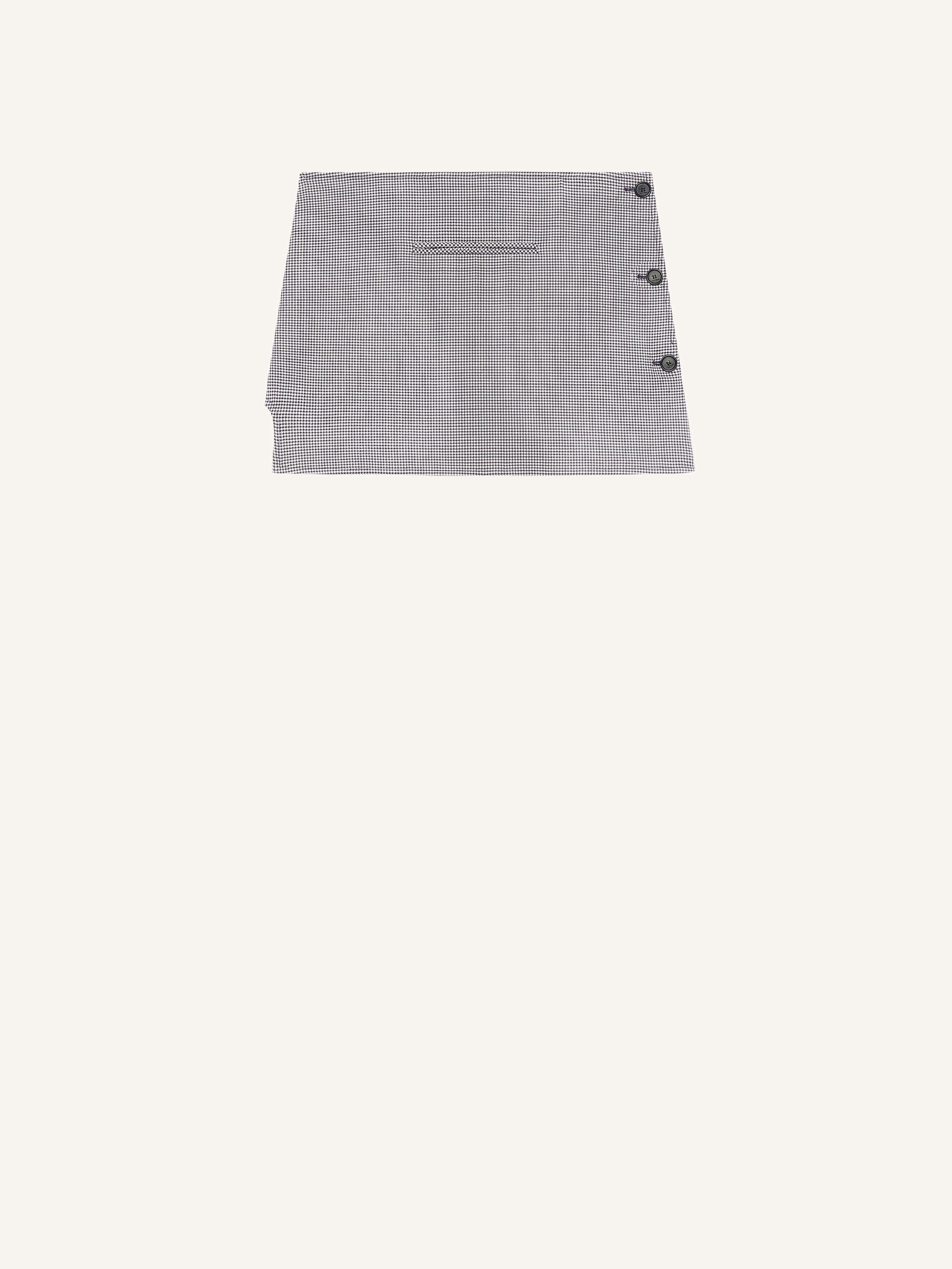 Mini skirt with side slit, center welt pocket and buttons at hip. Houndstooth print. The model is 1.78m tall and wears a size 36. DETAILS Composition: 51% polyester, 41% wool, 4% elastane, 4% polyamide Country of Manufacture: RO SKU: 424CJU204WO0125B123 Color: Black/Natural