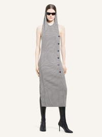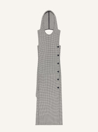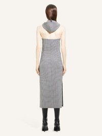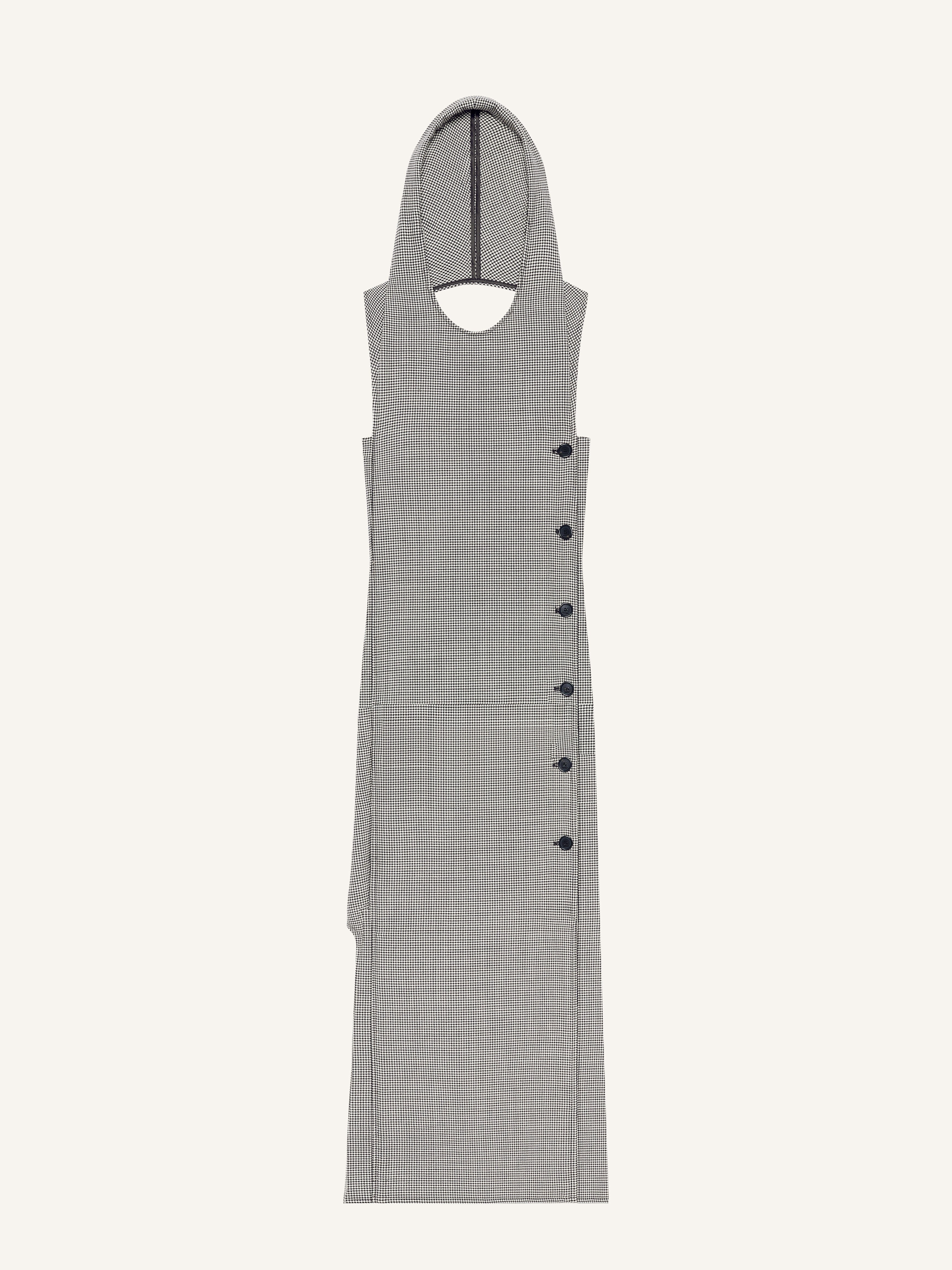 Hooded trapeze dress with front center welt pocket. Sleeveless. Bare upper back. Houndstooth jacquard. The model is 1.78m tall and wears a size 36. DETAILS Composition: 51% polyester, 41% wool, 4% elastane, 4% polyamide Country of Manufacture: FR SKU: 424CRO525WO0125B123 Color: Black/Natural