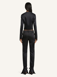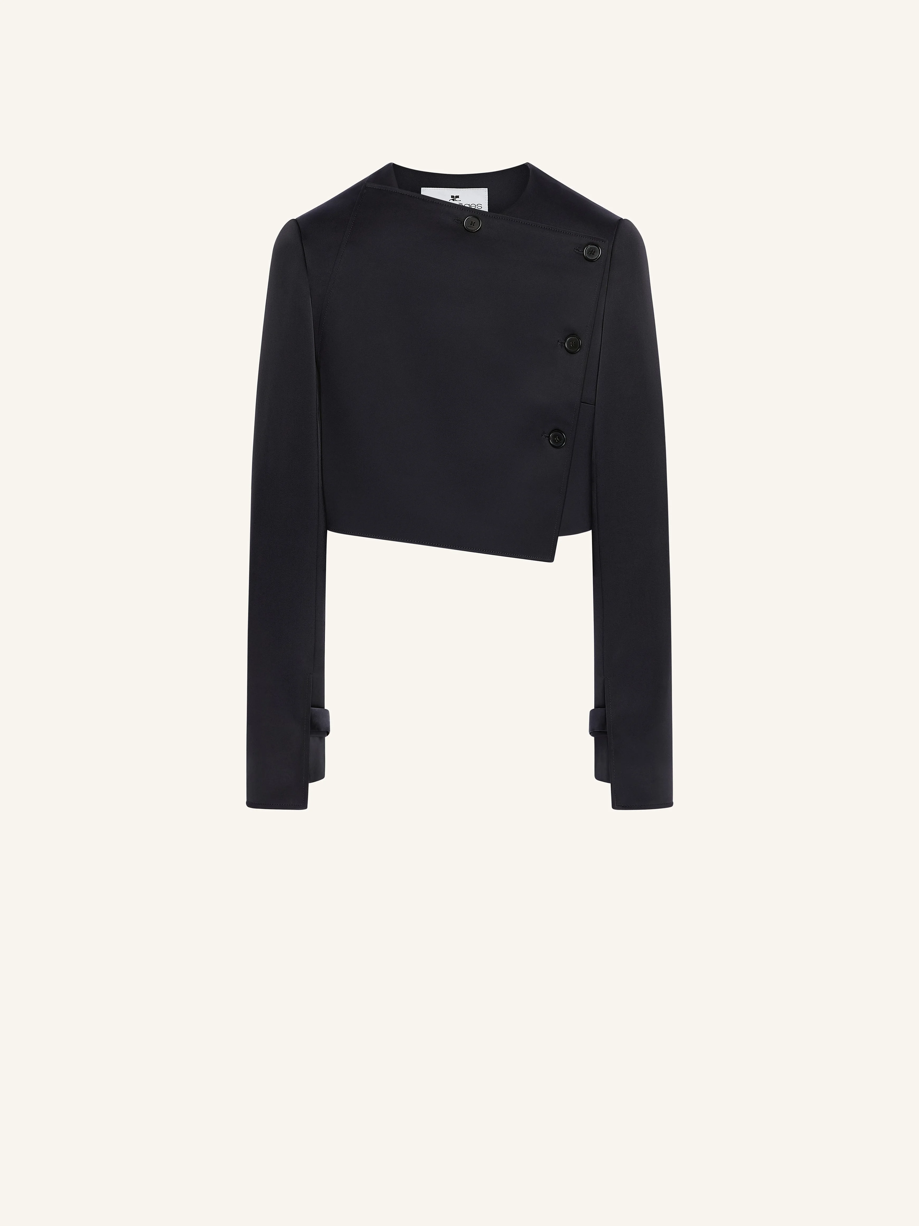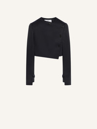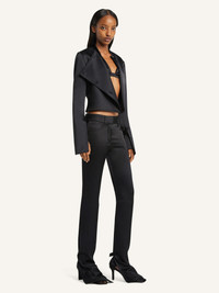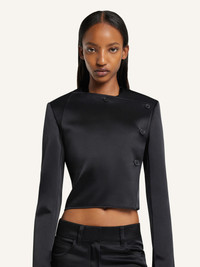Double breasted satin cropped jacket with sleeve detail and embroidered AC logo on back collar. The model is 1.75m tall and wears a size 36. DETAILS Composition: 83% triacetate, 17% polyester Country of Manufacture: SK SKU: 425CVE138TA00079999 Color: Black