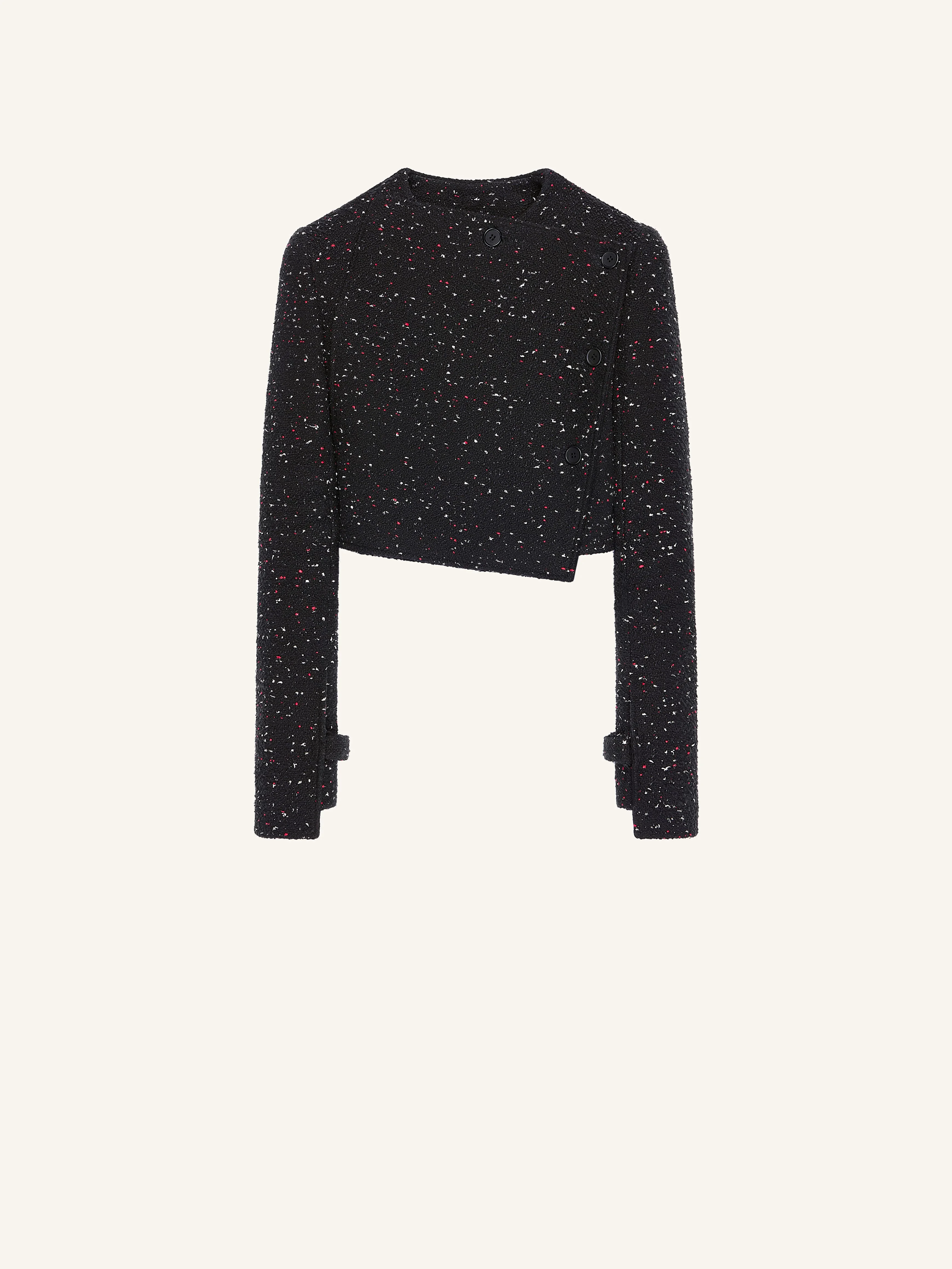 Double breasted tweed cropped jacket with sleeve detail and embroidered AC logo on back collar. The model is 1.78m tall and wears a size 36. DETAILS Composition: 36% acrylic, 32% cotton, 18% polyamide, 12% wool, 1% elastane, 1% polyester Country of Manufacture: SK SKU: 425CVE137WO01539999 Color: Black