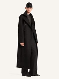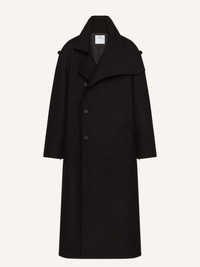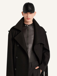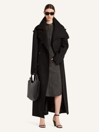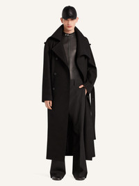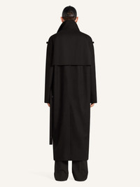 Long wool trench coat with large collar and waist belt. Buttoned front and side pockets. This item is unisex. The female model is 1.77m tall and the male model is 1.88m tall, both wearing size M. DETAILS Composition: 80% wool, 20% polyamide Country of Manufacture: SK SKU: 325CMA236WO00369999 Color: Black