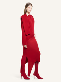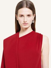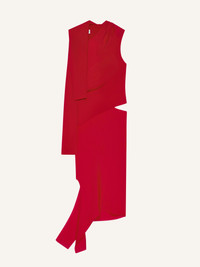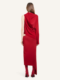 Long sleeves crepe long dress with a slash opening at the waist and a slit on the leg. One sleeve is placed over one shoulder to expose the other. The model is 1.76m tall and wears a size 36. DETAILS Composition: 70% polyester, 30% recycled polyester Country of Manufacture: IT SKU: 424CRO516PL01474015 Color: Ruby