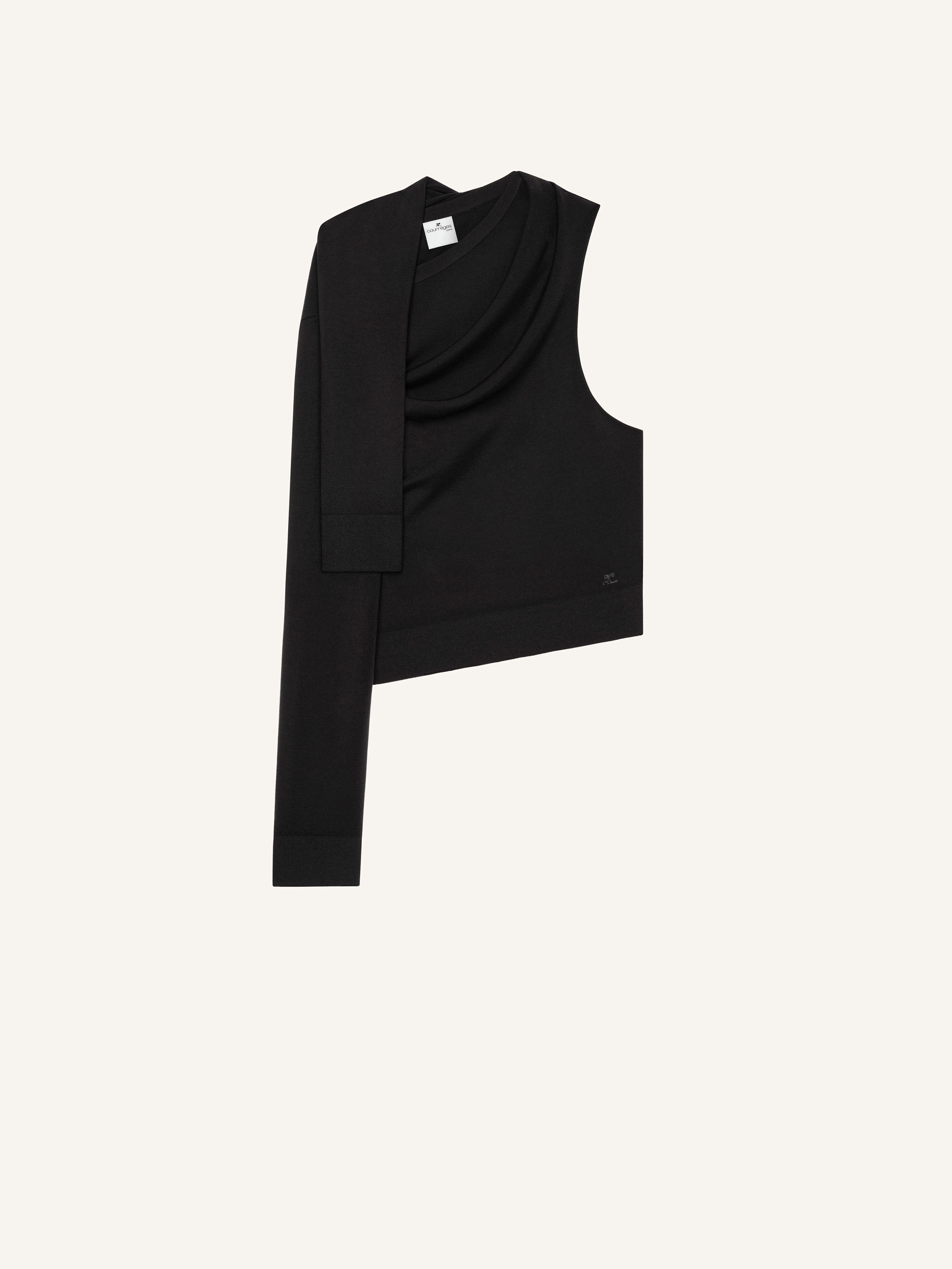 Straight knit sweater with long sleeves. One sleeve is buttoned over one shoulder to reveal the other. DETAILS Composition: 100% virgin wool Country of Manufacture: IT SKU: 424MPU199FI00609999 Color: Black