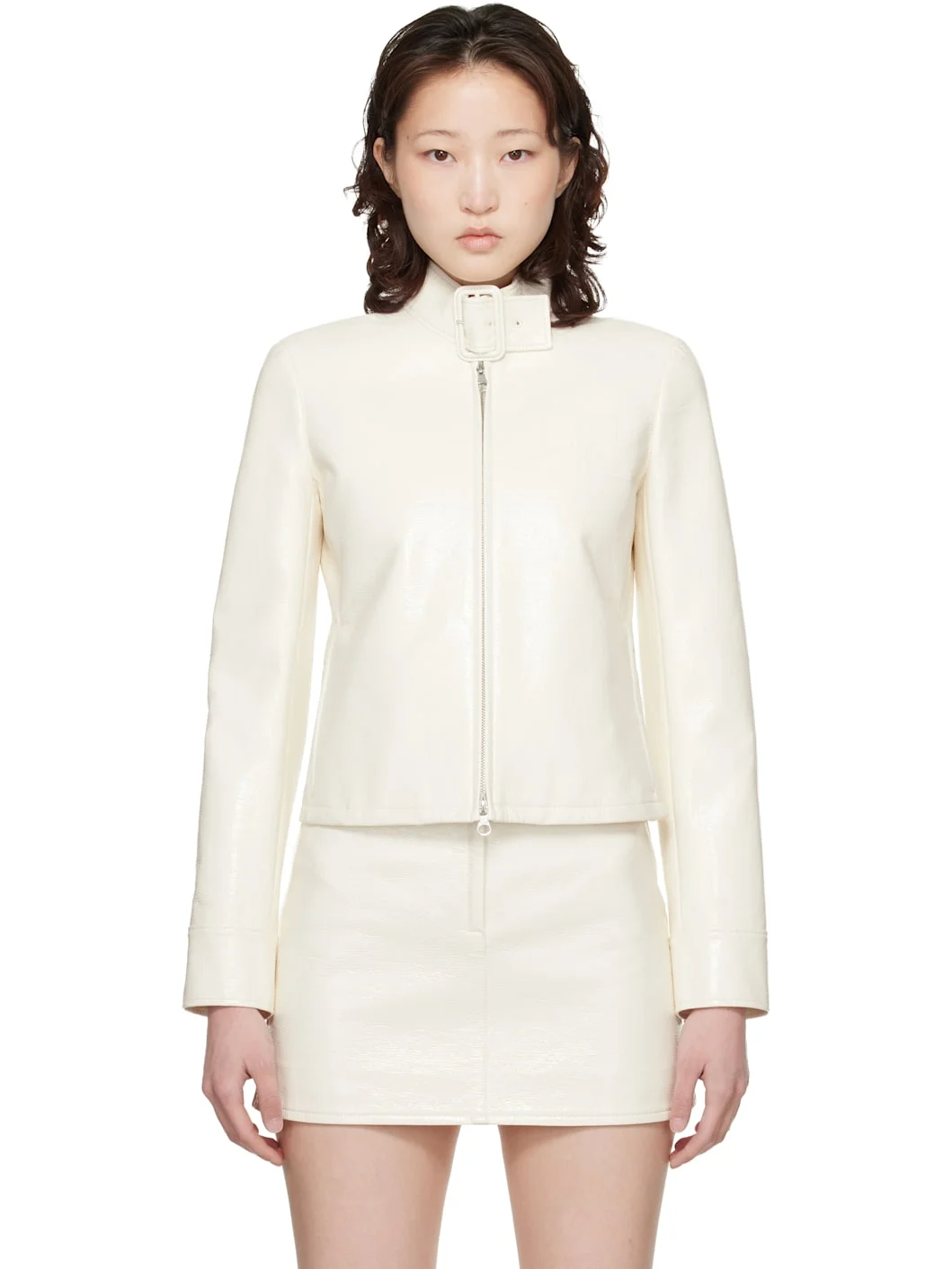Crinkled vinyl jacket. · Pin-buckle fastening at stand collar · Two-way zip closure · Logo embroidered at chest · Zip seam pockets · Press-stud barrel cuffs · Full satin lining Supplier color: Light bones Body: 89% polyurethane, 11% polyester. Lining: 100% viscose. Made in Slovakia (Slovak Republic) 261783F063006