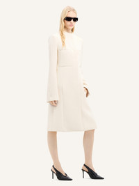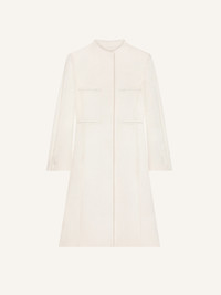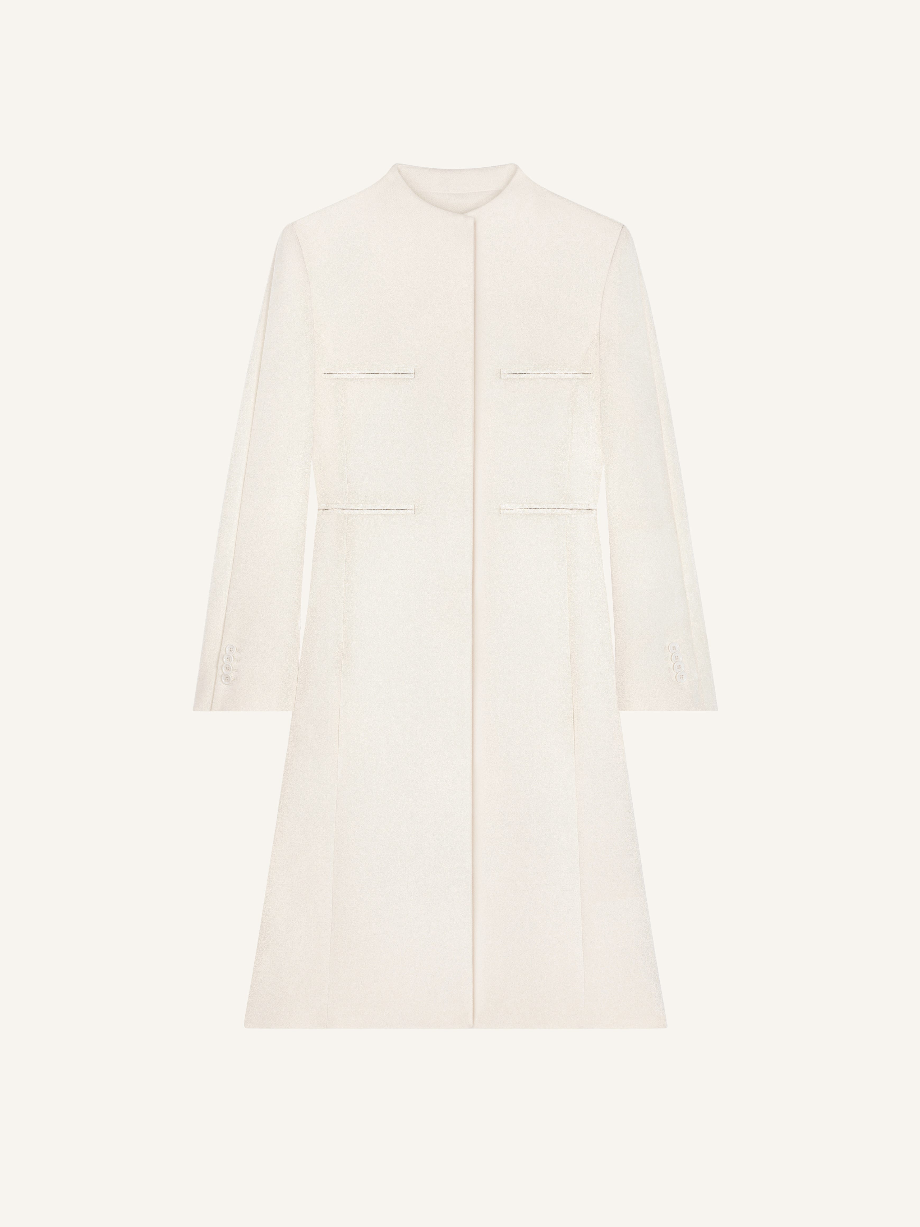 Heritage crepe coat with officer's collar. Long flared sleeves with buttons at cuffs. Four front welt pockets. AC logo at the back of the collar. The model is 1.75m tall and wears a size 36. DETAILS Composition: 100% polyester Country of Manufacture: SK SKU: 324CMA159PL00520079 Color: Natural Beige