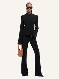 Fitted crepe tailored jacket. Officer's collar, long flared sleeves and four front welt pockets. AC logo on back of collar. The model is 1.78m tall and wears a size 36. DETAILS Composition: 100% polyester Country of Manufacture: SK SKU: 324CVE091PL00529999 Color: Black