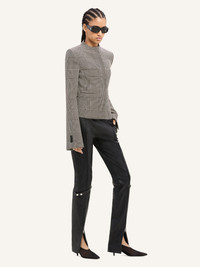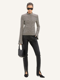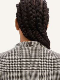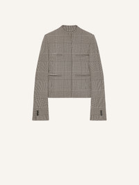 Prince of Wales fitted tailored jacket. Officer's collar, long flared sleeves and four front welt pockets. AC logo on back of collar. The model is 1.76m tall and wears a size 36. DETAILS Composition: 51% polyester, 49% wool Country of Manufacture: SK SKU: 324CVE091PL0165B107 Color: Sand / Mud Brown