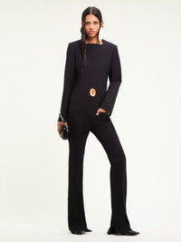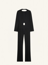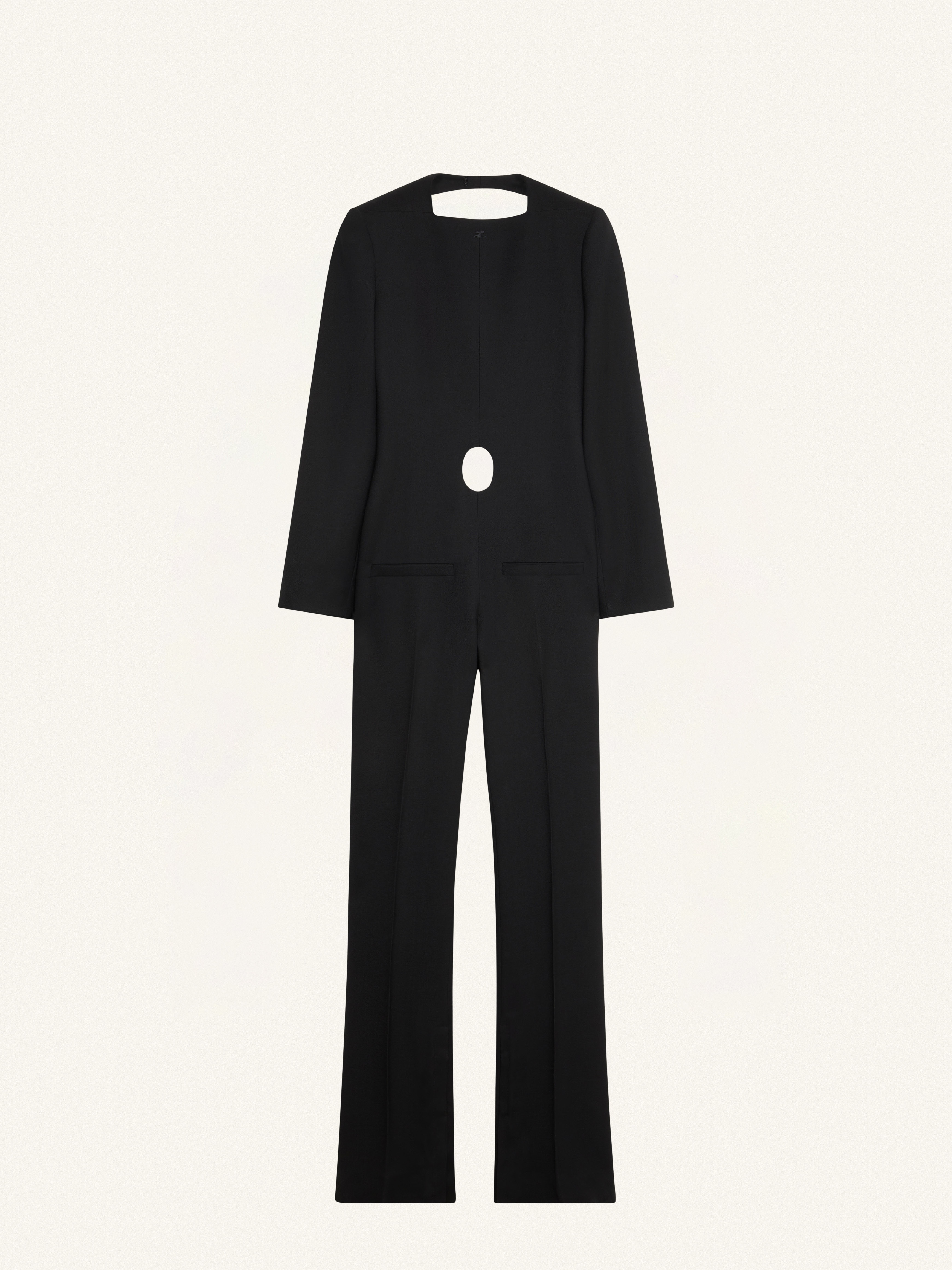This tailored jumpsuit offers a straight shape and naked back. It has a round cut out on the navel and welt pockets. DETAILS Composition: 100% Virgin Wool Made in: Italy Color: Black Code Article : 423CCB027WO0080