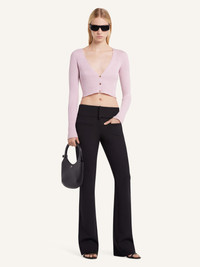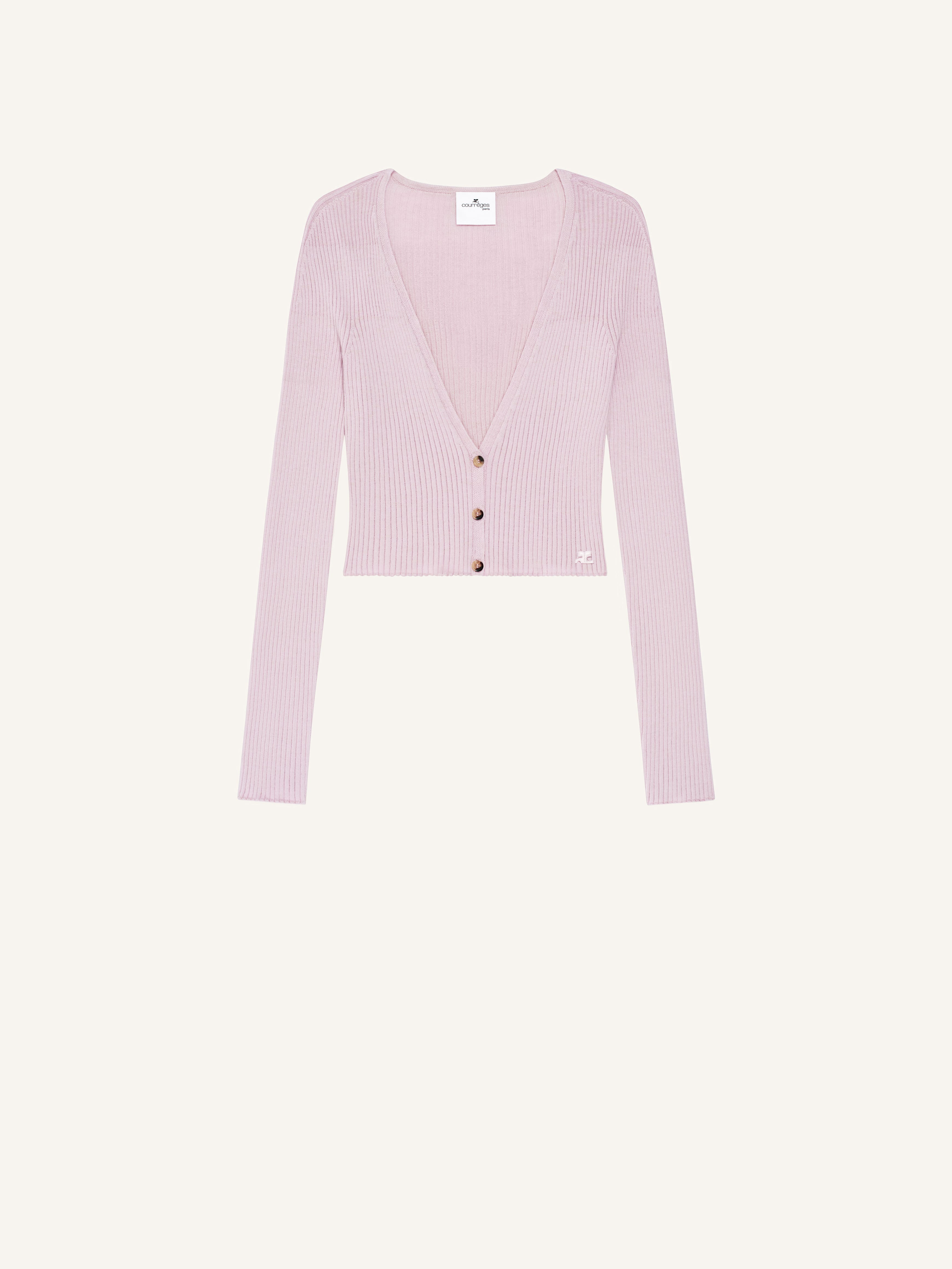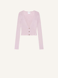 Cropped light solar rib knit cardigan with front button fastening. Polo collar and AC logo on front hem. The model is 1.77m tall and wears a size S. DETAILS Composition: 80% cotton , 20% merino wool Country of Manufacture: IT SKU: 225MGI034FI00496017 Color: Salt Pink