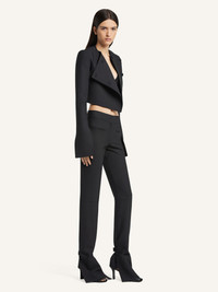Polywool bootcut pants with bottom-leg detail and adjustable ankle band. Front and back welt pockets. AC logo on back pocket. The model is 1.78m tall and wears a size 36. DETAILS Composition: 51% polyester, 41% wool, 4% elastane, 4% polyamide Country of Manufacture: FR SKU: 425CPA437PL01709999 Color: Black