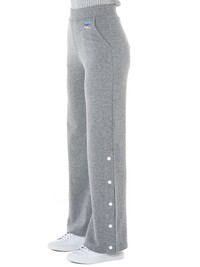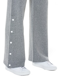 Courrèges flared lounge trouser in grey, lacquered press studs at outseam slits, side pockets, turn under bottom hem, tonal stitching. Composition - 100% Cotton Model wears a size 1.