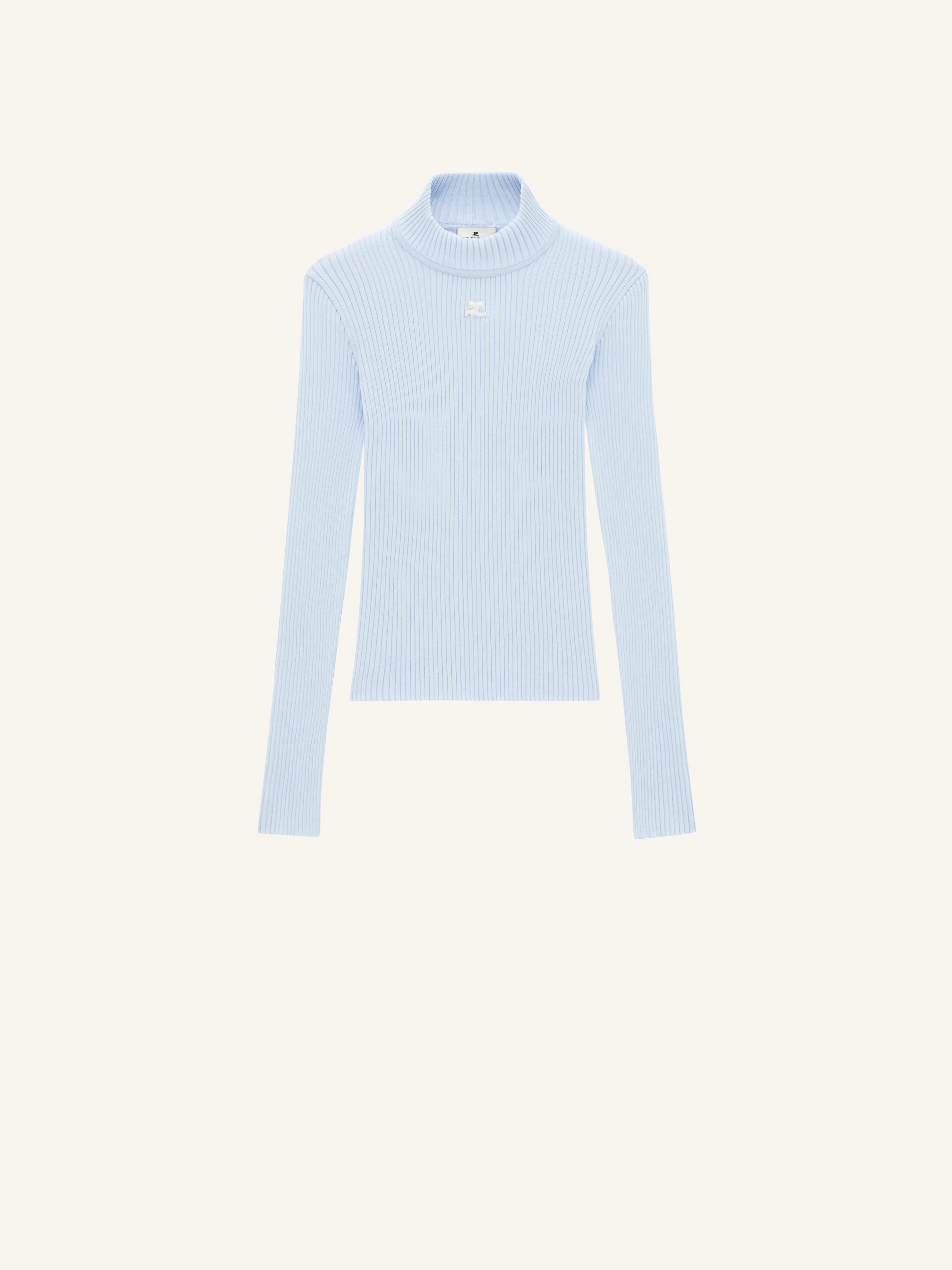 The ribbed knit is a timeless Courrèges piece. 100% cotton made, it is declined here in a long sleeves version with a high collar and enhanced on the front with our embroidered white AC logo. DETAILS Composition: PERMPU022FI0001 Country of manufacture: Bulgarie Colour: Ciel Item code: PERMPU022FI00017005