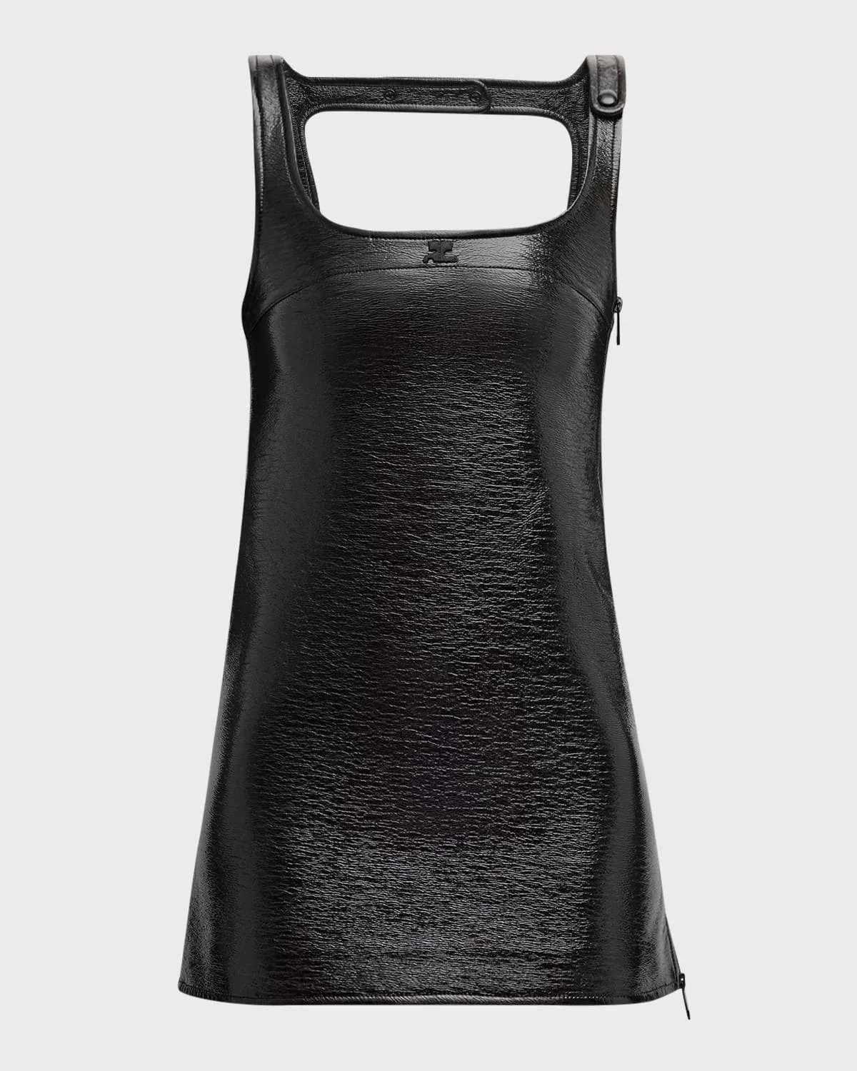 Courreges reedition vinyl dress featuring snap strap details and logo embroidered front Scoop neckline Sleeveless Aline silhouette Mini length Twoway side zip Cotton/polyurethane Imported