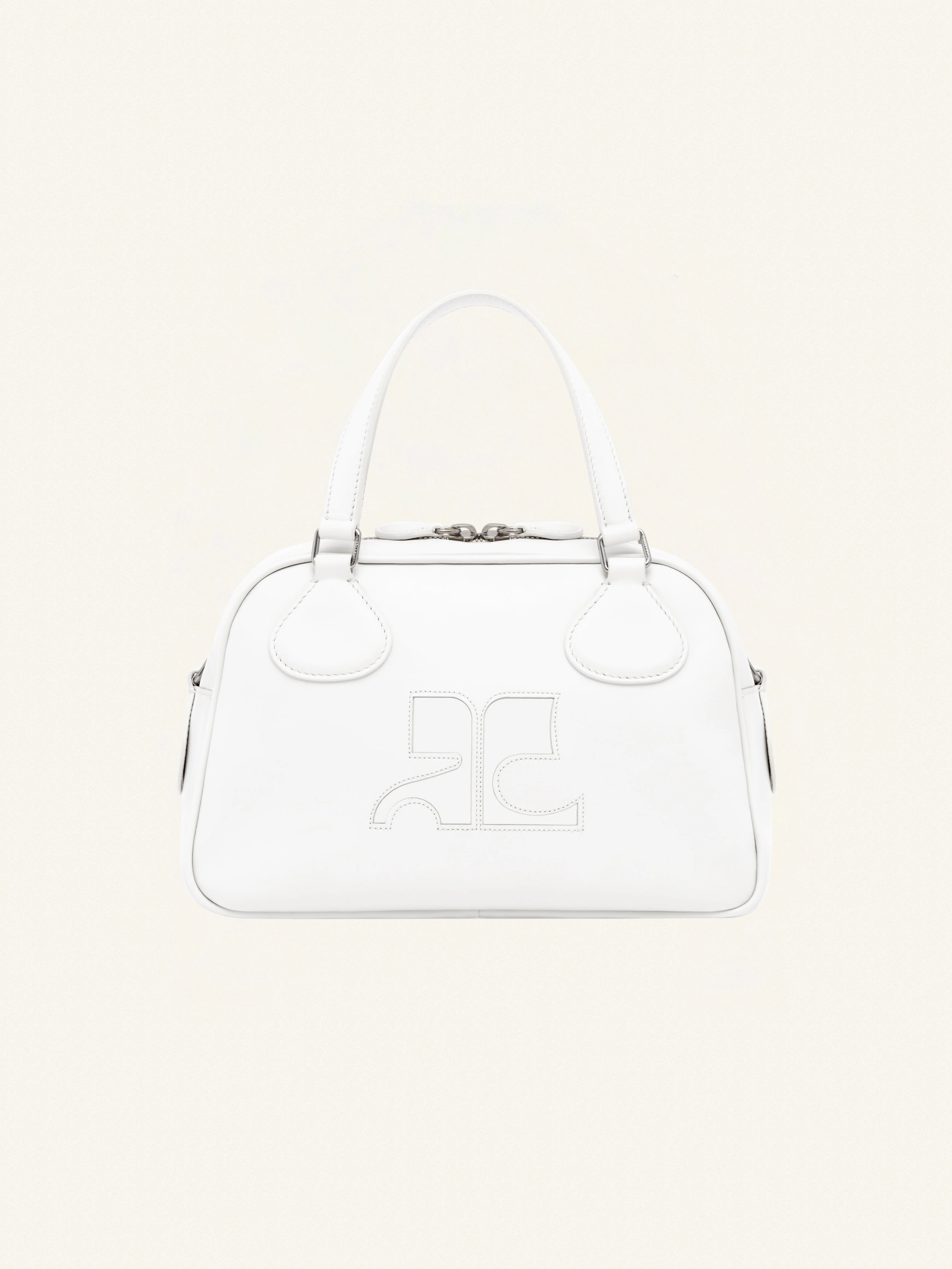 Reedition leather Bowling bag with AC logo inlaid on front. Metal zipper closure. Short handles with removable and adjustable shoulder strap. Inside zipped pocket. Length: 25 cm Height: 15.5 cm Width: 12 cm DETAILS Composition : 100% VACHETTE 100% COTON 55% POLYAMIDE/NYLON 25% POLYURETHANE 20% ELASTHANE Color : Heritage white Item code : PERGSA062CR00450001
