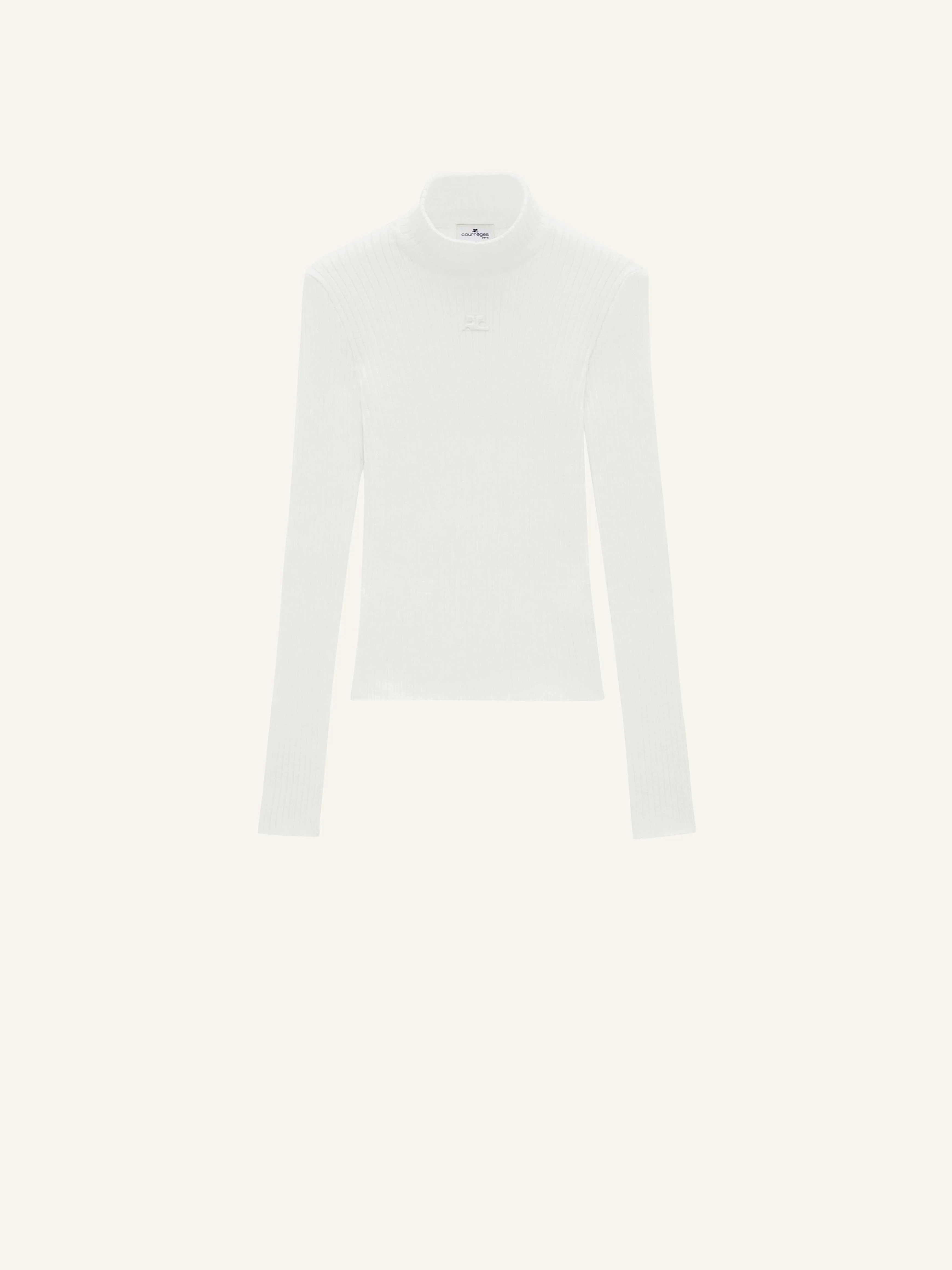 The ribbed knit is a timeless Courrèges piece. It is declined here in a long sleeves version with a high collar and enhanced on the front with our embroidered white AC logo. DETAILS Composition: 70% Viscose 30% Polyester Country of manufacture: Bulgaria Color : Heritage White Item Code :PERMPU022FI00010001