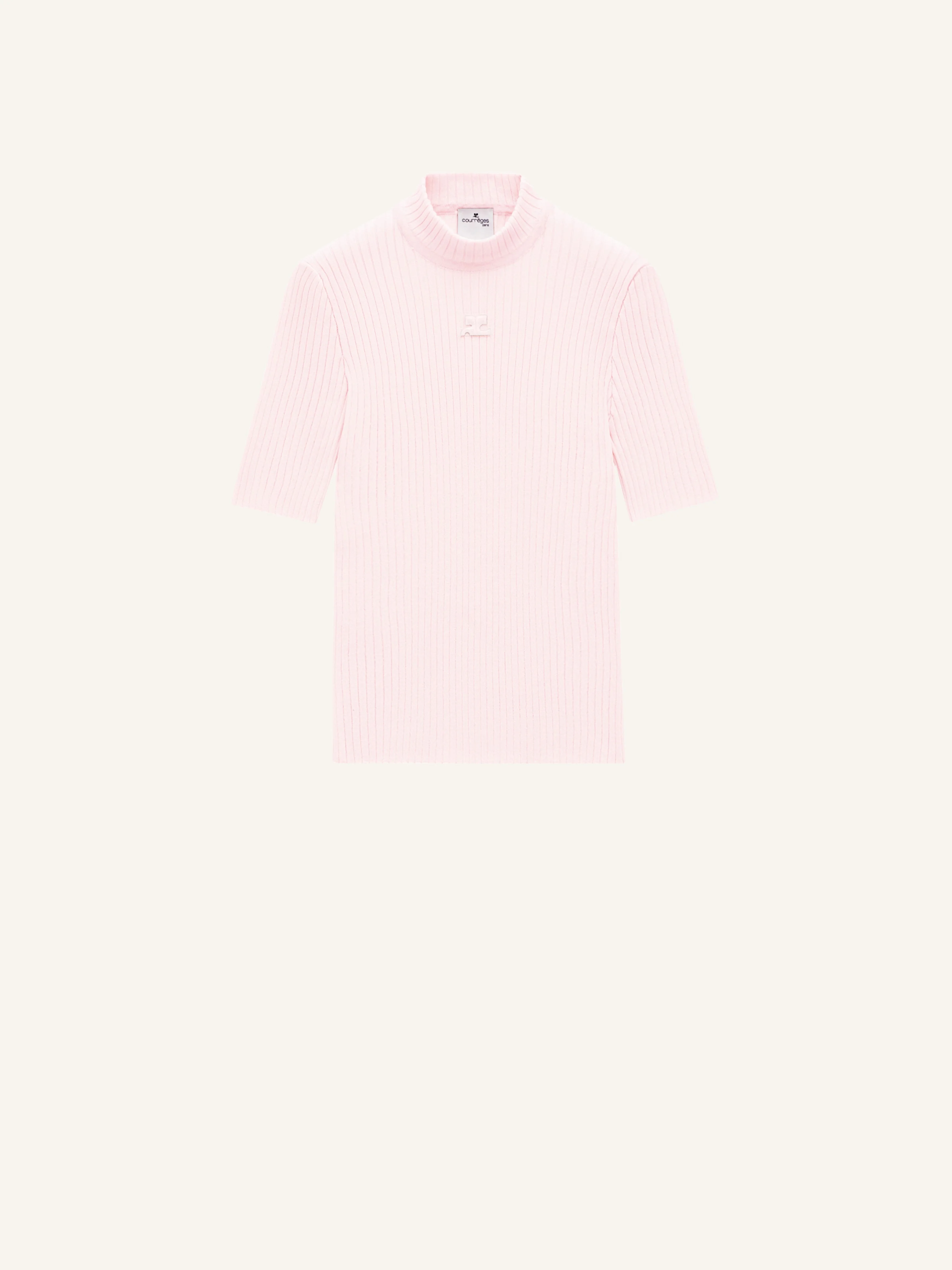 The ribbed knit is a timeless Courrèges piece. It is declined here in a short sleeves version with a high collar and enhanced on the front with our embroidered white AC logo. DETAILS Composition : 70% VISCOSE 30% POLYESTER Color : Light pink Item code : PERMPU026FI00015009