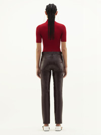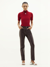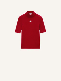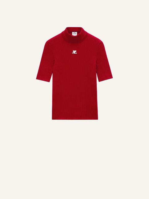 The ribbed knit is a timeless Courrèges piece. It is declined here in a short sleeves version with a high collar and enhanced on the front with our embroidered white AC logo. DETAILS Composition: 70% Viscose 30% Polyester Country of manufacture: Bulgaria Color : Red Item Code :PERMPU026FI00014034