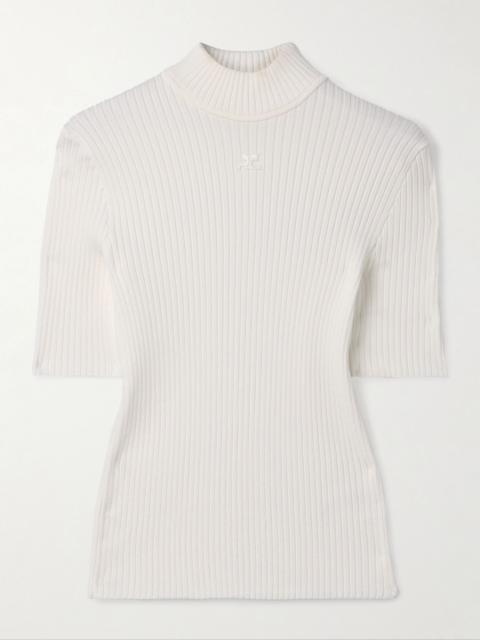 Embroidered ribbed-knit top