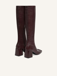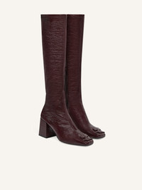 Iconic stretch vinyl boots. Knee-high, square heel and toe with covered AC logo on top of foot. Stem: 41 cm Heel: 7 cm DETAILS Composition: 88% cotton, 10% polyurethane, 2% elastane Country of Manufacture: IT SKU: PERSBT002VY00154010 Color: Burgundy