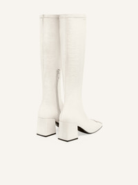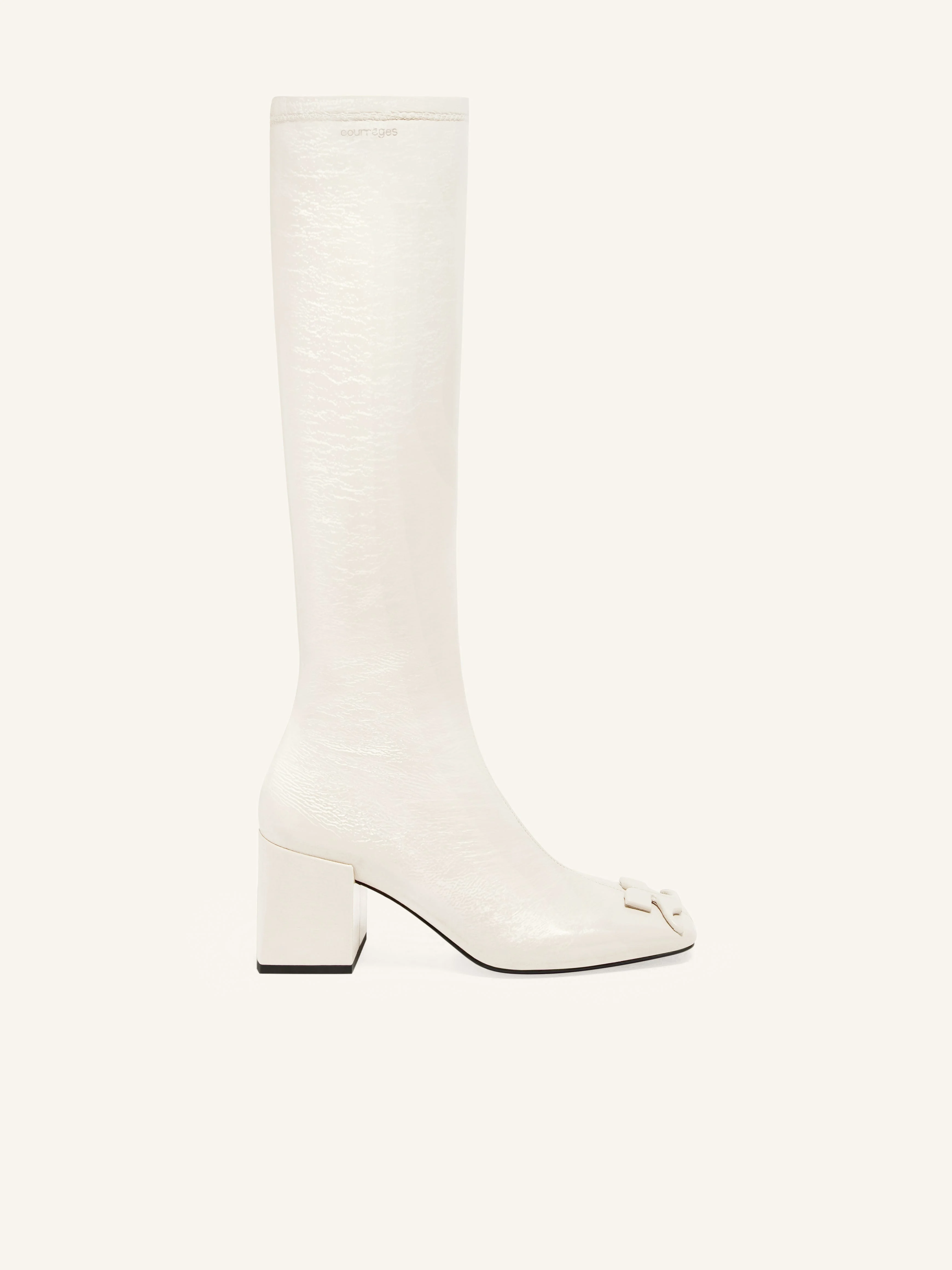 Iconic stretch vinyl boots. Knee-high, square heel and toe with covered AC logo on top of foot. Stem: 41 cm Heel: 7 cm DETAILS Composition: 88% cotton, 10% polyurethane, 2% elastane Country of Manufacture: IT SKU: PERSBT002VY00150001 Color: Heritage White