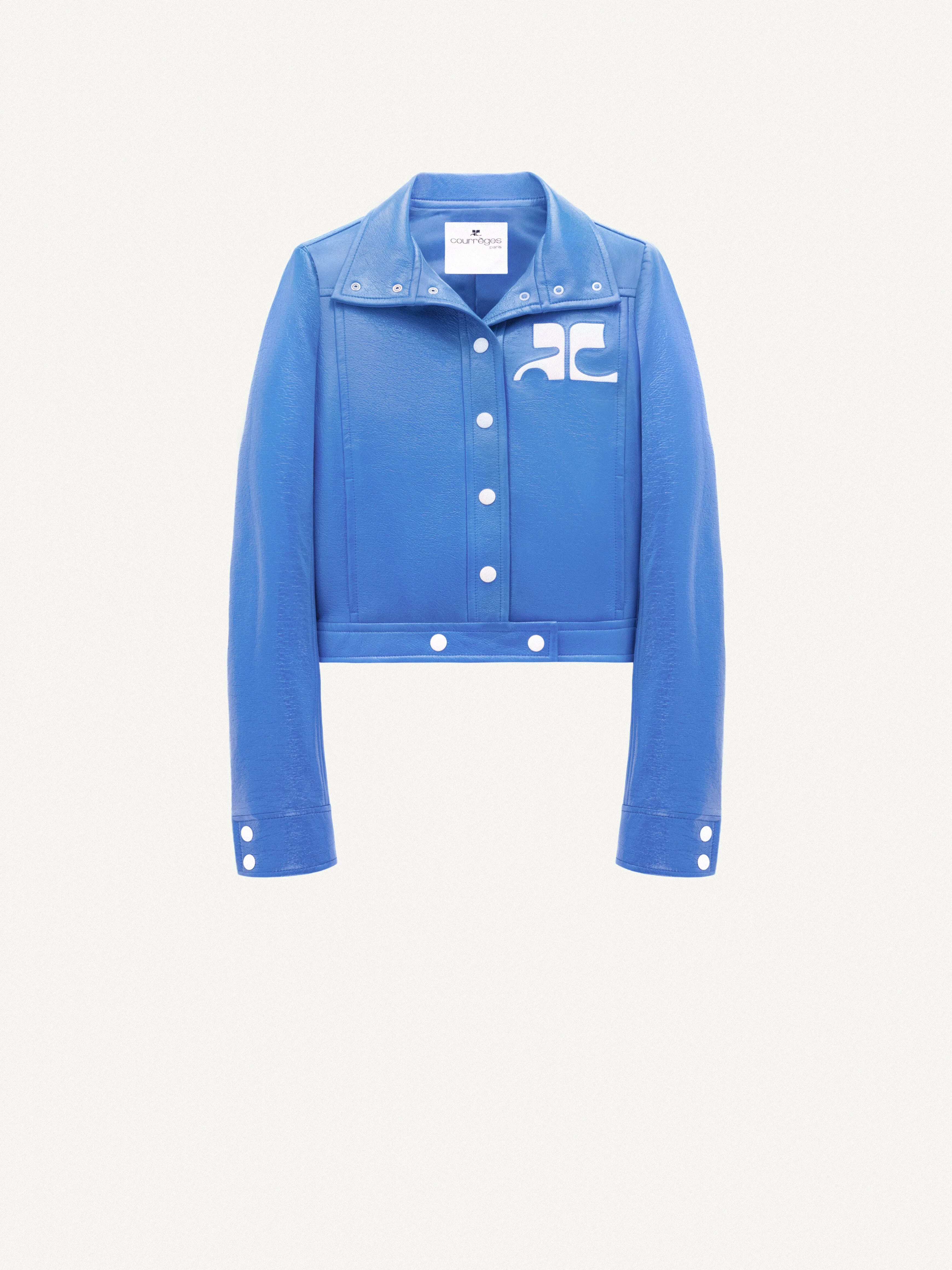 Inspired by the house's emblematic 1971 style, this iconic vinyl jacket features a white AC logo inlaid on the chest. With two side pockets and a press buttons closure in the middle front and on the cuffs, as well as a high collar. This model is lined. The cut of the vinyl jacket from the Reeditions collection is close to that of the iconic model from 1971. It is a tight fit and was designed to be worn open. For more ease, we recommend that you choose the next size up from your usual size. DETAILS Composition : 88% COTON 10% POLYURETHANE 2% ELASTHANE 55% POLYAMIDE/NYLON 25% POLYURETHANE 20% ELASTHANE 100% CUPRO Color : Blue Item code : PERCBL005VY00147050