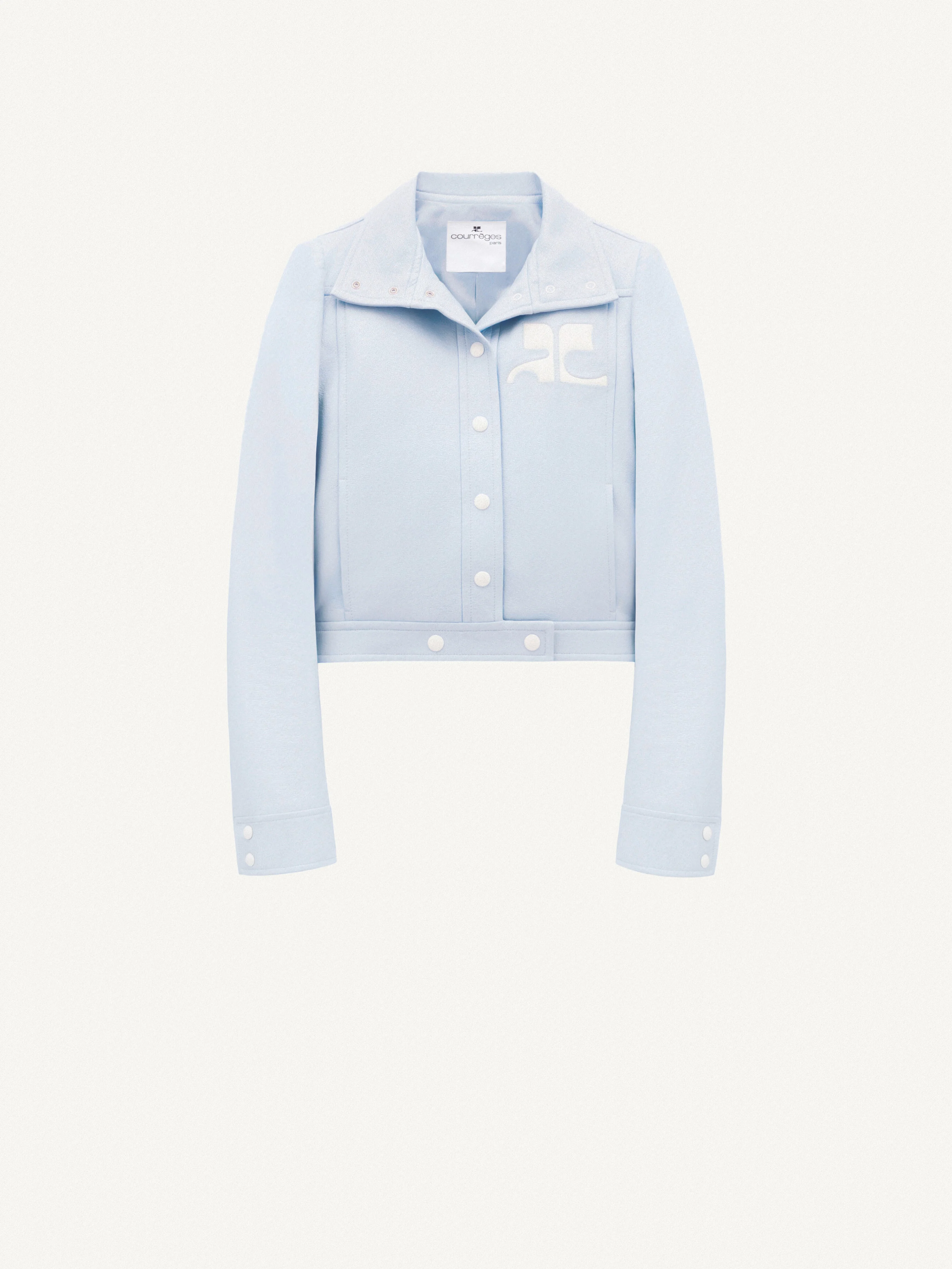 Inspired by the house's emblematic 1971 style, this iconic vinyl jacket features a white AC logo inlaid on the chest. With two side pockets and a press buttons closure in the middle front and on the cuffs, as well as a high collar. This model is lined. The cut of the vinyl jacket from the Reeditions collection is close to that of the iconic model from 1971. It is a tight fit and was designed to be worn open. For more ease, we recommend that you choose the next size up from your usual size. DETAILS Composition : 88% COTON 10% POLYURETHANE 2% ELASTHANE 55% POLYAMIDE/NYLON 25% POLYURETHANE 20% ELASTHANE 100% CUPRO Color : Sky blue Item code : PERCBL005VY00147005