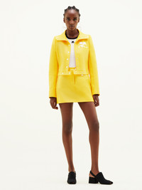 Inspired by the house's emblematic 1971 style, this iconic vinyl jacket features a white AC logo inlaid on the chest. With two side pockets and a press buttons closure in the middle front and on the cuffs, as well as a high collar. This model is lined. The cut of the vinyl jacket from the Reeditions collection is close to that of the iconic model from 1971. It is a tight fit and was designed to be worn open. For more ease, we recommend that you choose the next size up from your usual size. DETAILS Composition : 88% COTON 10% POLYURETHANE 2% ELASTHANE 55% POLYAMIDE/NYLON 25% POLYURETHANE 20% ELASTHANE 100% CUPRO Color : Yellow Item code : PERCBL005VY00142051