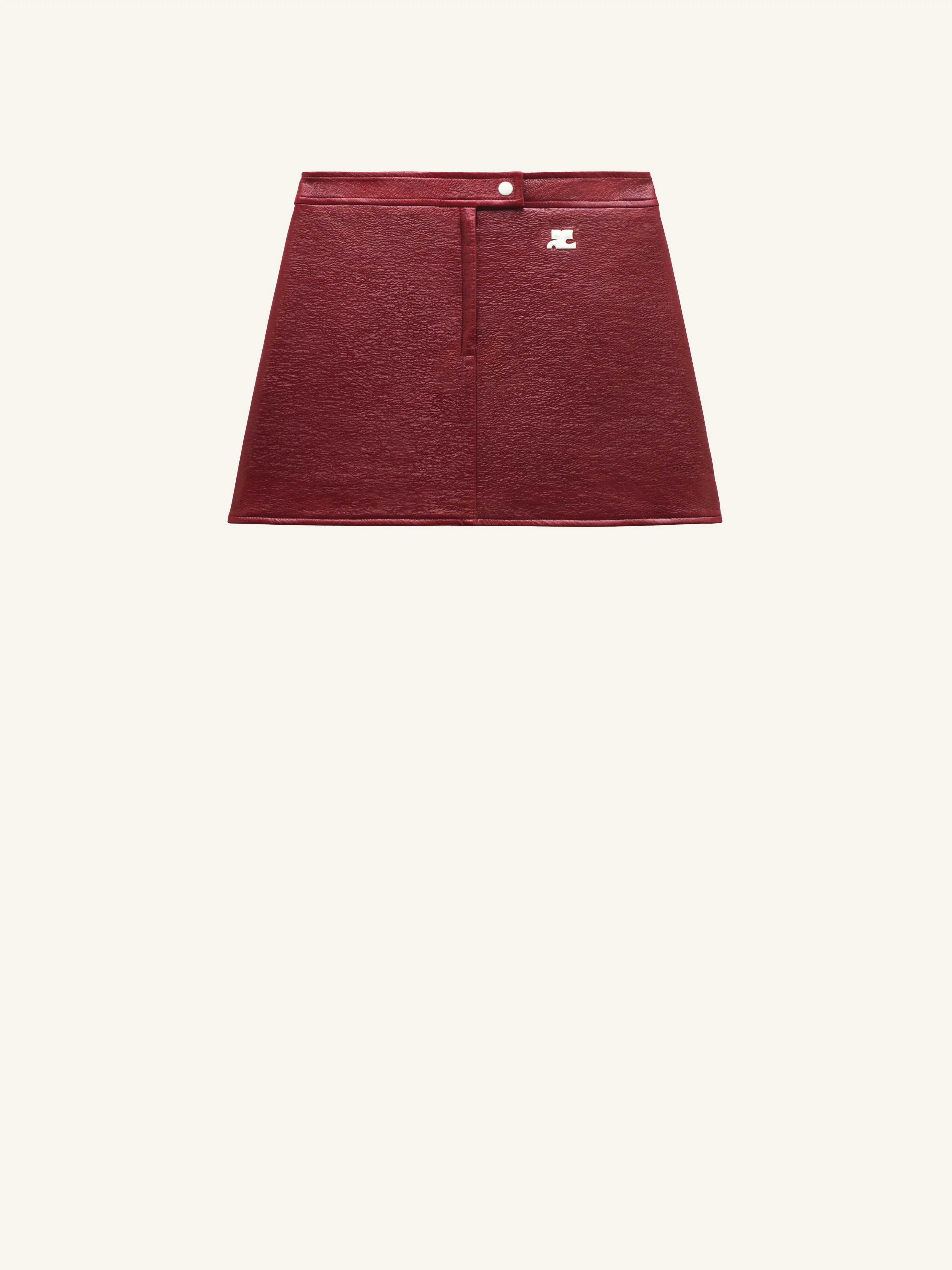 Vinyl miniskirt with white embroidered AC logo on the front. Closure fly style Courrèges with zip and white lacquered pressure. Darts in the back. Lined model. DETAILS Composition : 88% COTON 10% POLYURETHANE 2% ELASTHANE 100% CUPRO Color : Red Item code : PERCJU001VY00144034