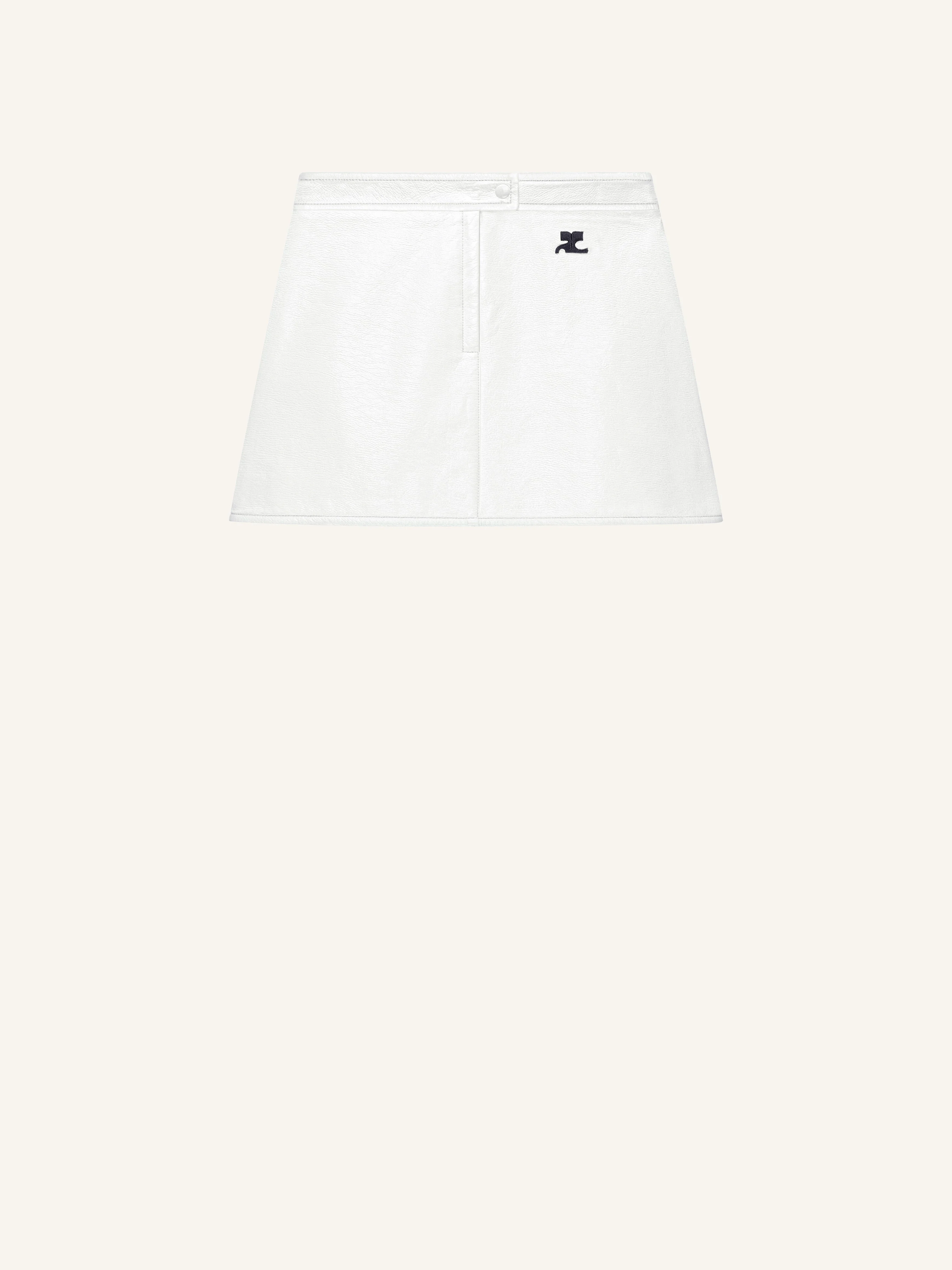 Iconic lined vinyl mini skirt with contrast AC logo on the front. White lacquered belt snaps and zipper fly. The model is 1.79m and wears a size 36. DETAILS Composition: 88% cotton, 10% polyurethane, 2% elastane Country of Manufacture: RS SKU: 625CJU001VY00140001 Color: Heritage White