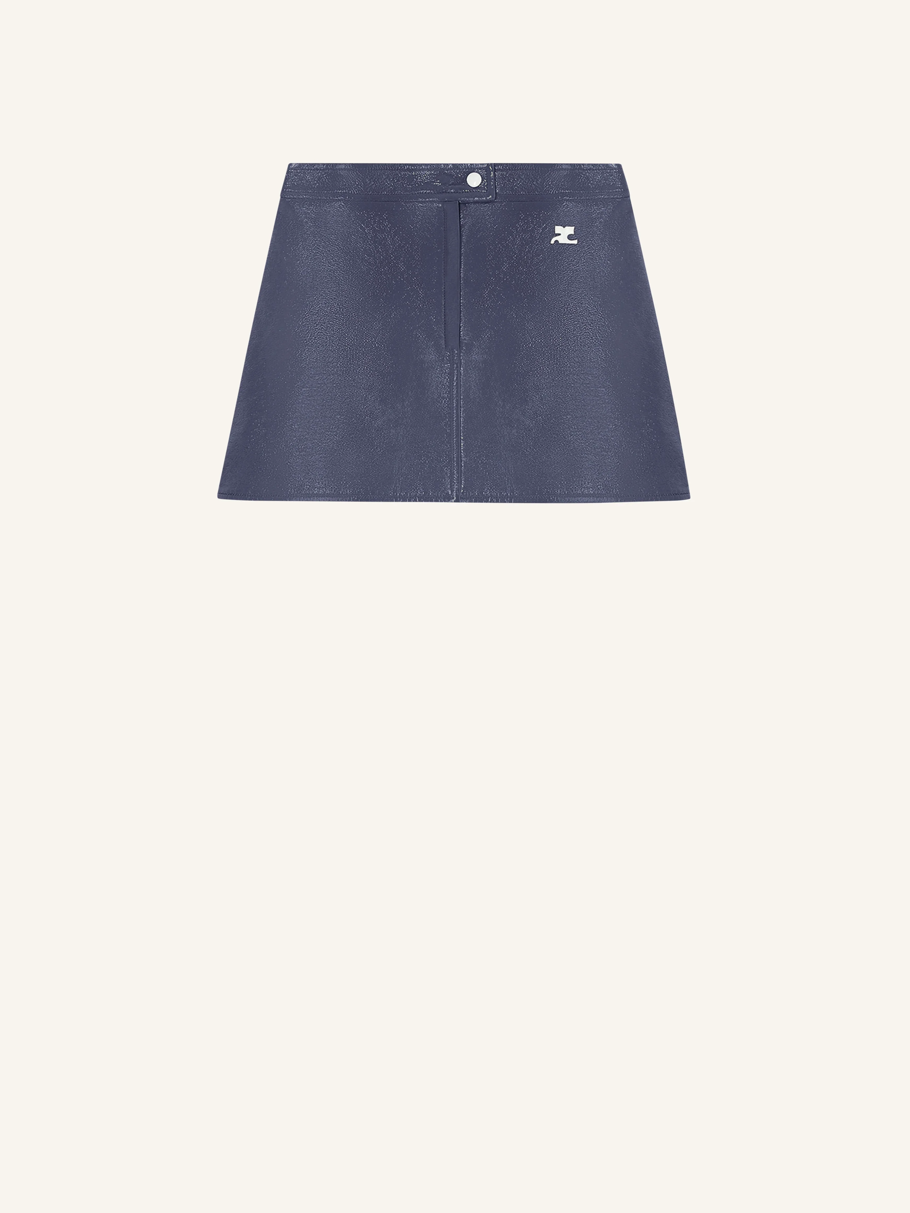 Iconic lined vinyl mini skirt with white AC logo on the front. White lacquered belt snaps and zipper fly. DETAILS Composition: 88% cotton 10% polyurethane 2% elastane Country of Manufacture: RS SKU: 223CJU001VY00147095 Color: Dusk Blue