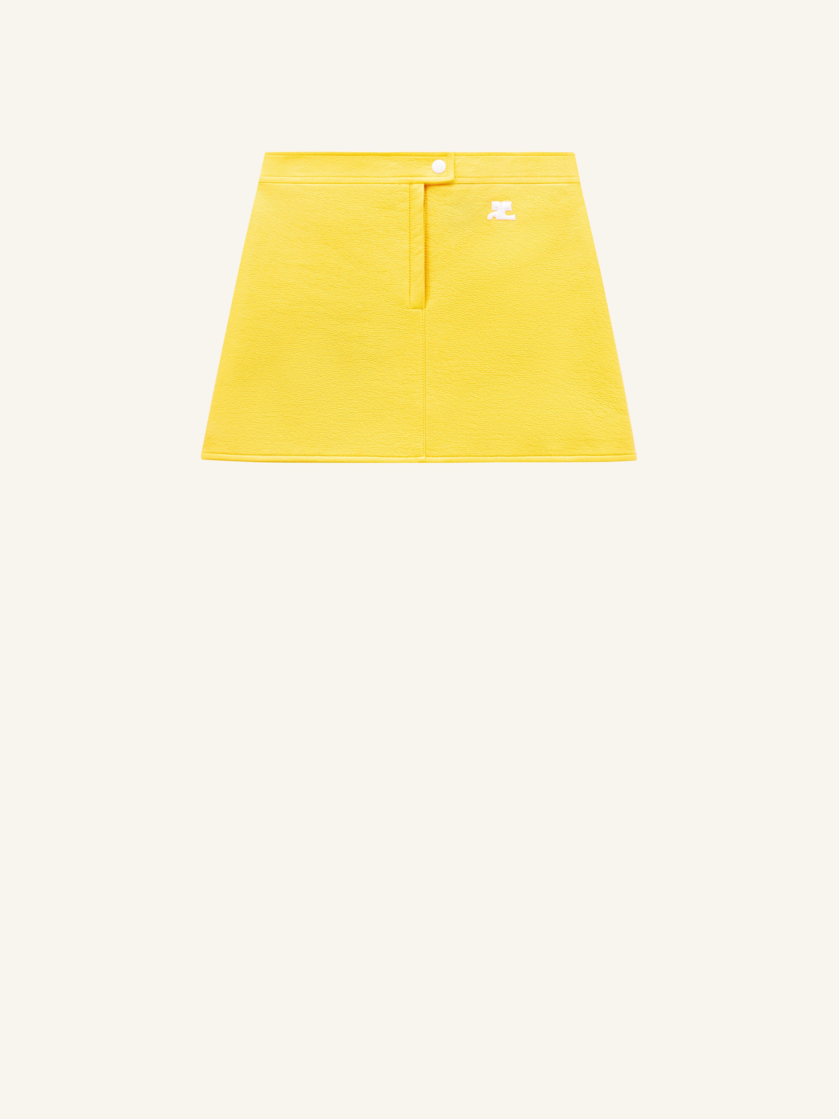 Vinyl miniskirt with white embroidered AC logo on the front. Closure fly style Courrèges with zip and white lacquered pressure. Darts in the back. Lined model. DETAILS Composition : 88% COTON 10% POLYURETHANE 2% ELASTHANE 100% CUPRO Color : Yellow Item code : PERCJU001VY00142051