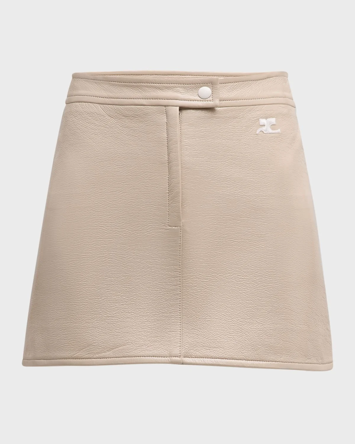 - Courreges "Reedition" vinyl skirt featuring logo embroidered side - High waist - A-line silhouette - Mini length - Snap-tab/zip fly - Cotton/polyurethane/elastane - Lining: Cupro - Imported - Model is 5'10"/177cm.
