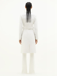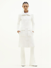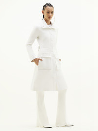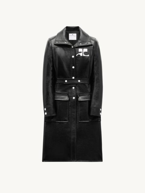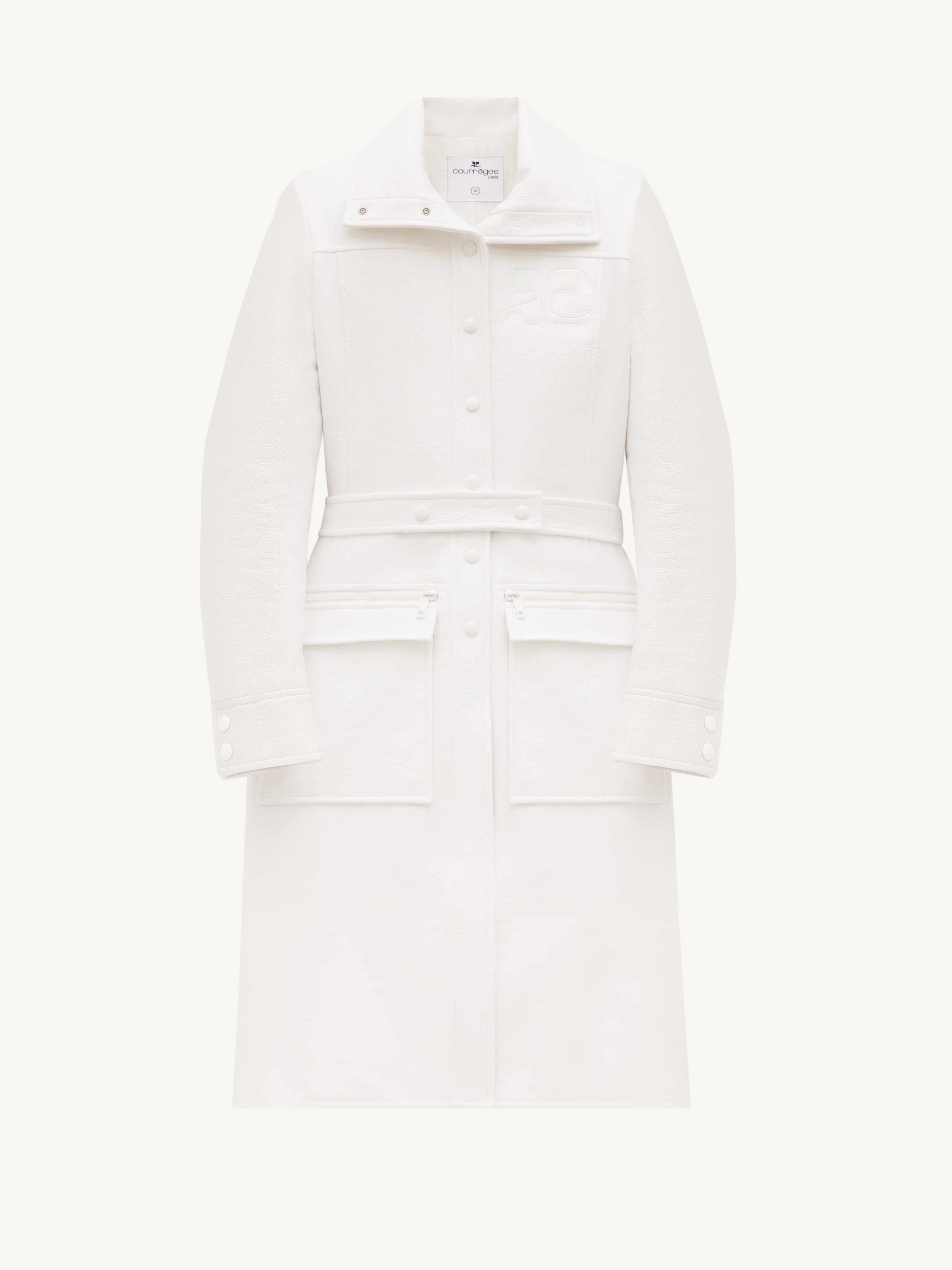 Inspired by the house's emblematic 1972 style, this iconic vinyl trench features a white AC logo inlaid on the chest. The belt is detachable and has a zipped pocket as well as a double entry patch pocket and a high collar. Closure by visible white lacquered press buttons on the middle front as well as on the cuffs and a back slit. This model is lined. DETAILS Composition: PERCMA078VY0014 Colour: Blanc Héritage Item code: PERCMA078VY00140001